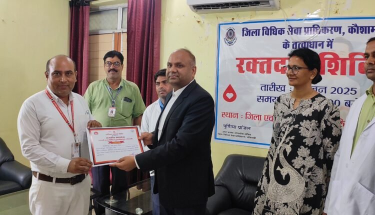 कौशाम्बी: उत्तर प्रदेश राज्य विधिक सेवा प्राधिकरण द्वारा प्रस्तावित एक्शन प्लान के तहत श्री जे0 पी0 यादव जनपद न्यायाधीश/अध्यक्ष, जिला विधिक सेवा प्राधिकरण, कौशाम्बी के निर्देशन पर एवं जिला विधिक सेवा प्राधिकरण, कौशाम्बी के तत्वाधान में जिला एवं सत्र न्यायालय परिसर, कौशाम्बी में रक्तदान शिविर का आयोजन किया गया। उक्त कार्यक्रम में माननीय जनपद न्यायाधीश/अध्यक्ष, जिला विधिक सेवा प्राधिकरण व प्रभारी सचिव, जिला विधिक सेवा प्राधिकरण, कौशाम्बी श्री बृजेश कुमार यादव, मुख्य न्यायिक मजिस्ट्रेट, श्री दीपक जायसवाल तथा राजकीय रक्त केन्द्र, स्वशासी राज्य चिकित्सा महाविद्यालय एवं बी0सी0टी0वी0, प्रयागराज की टीम उपस्थित रहें।