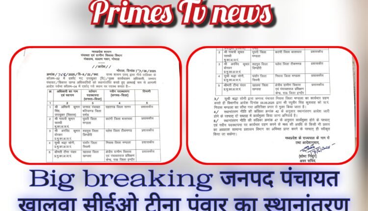Big breaking जनपद पंचायत खालवा सीईओ टीना पंवार का स्थानांतरण देखिए आदेश जारी पढ़िए पूरी खबर खंडवामध्यप्रदेश By Prime Sandesh On Jun 18, 2025 0 349 Share Big breaking जनपद पंचायत खालवा सीईओ टीना पंवार का स्थानांतरण देखिए आदेश जारी पढ़िए पूरी खबर Join Primes Tv WhatsApp Group / Channel: +918109571743 0 349 Share