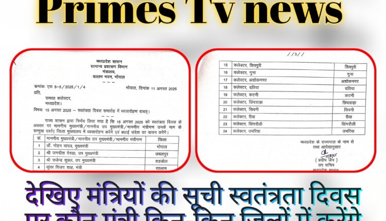 भोपाल::सामान्य प्रशासन विभाग द्वारा 15 अगस्त 2025 को स्वतंत्रता दिवस के अवसर पर मुख्यमंत्री, उप मुख्यमंत्री और मंत्रीगण जिला मुख्यालयों में ध्वजारोहण करेंगे और मुख्यमंत्री के संदेश का वाचन करेंगे, इस संबंध में आदेश जारी किए गए हैं।