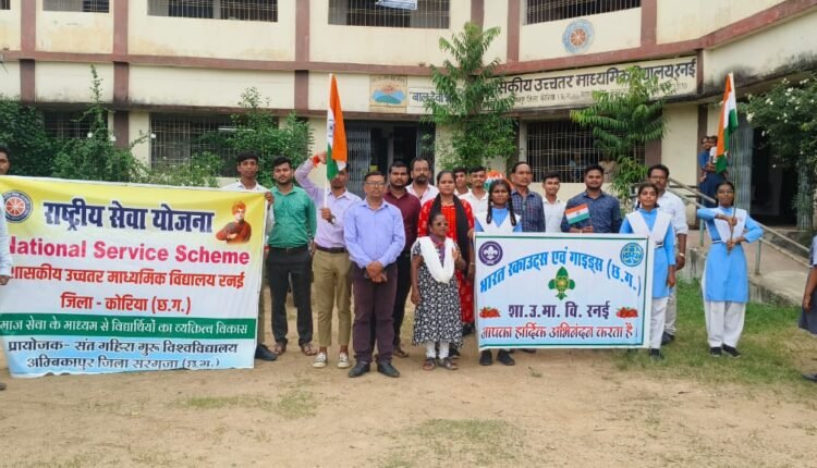 हाई सेकेंडरी मिडिल व प्राथमिक शाला के बच्चो ने रैली निकाल कर हर घर में तिरंगा लहराने कि नारे बाजी करते हुए बच्चों मे बड़ी खुशहाली का माहौल देखने को मिला विशेष बात यह है कि पटना थाना अंतर्गत ग्राम रनई के के हाई स्कूल के प्रचार प्राचार्य भास्कर आनंद कुशवाहा ने बताया कि हमें हमारे बच्चे ही कह रहे हैं हर घर में तिरंगा लहराने का पूरे विद्यालयों में आसपास के शहरों मेतिरंगा लहराने का जो अभियान चल रहा है यह परंपरा कई वर्षों से चल रहा है हमें गर्व है कि हमारा देश आजादी के बाद भी हमारे भारत माता की शान को अपने जान से ज्यादा हमारे भारत वासियों को प्यारी है इसे आजादी के तौर पर हमारे छत्तीसगढ़ में नहीं बल्कि पूरे देश में घर-घर में तिरंगा झंडा लहराने का संकल्प लिया भास्कर आनंद कुशवाहा ने बताया कि हमारे इस स्कूल में यहांआज मुझे 15 साल से ऊपर हो गए जब से मैं यहां पदस्थ हूं हमारे स्कूल के बच्चे इसी तरह से कई रैलियां निकाल कर गांव में कई योजनाओं को जैसे नशा मुक्ति के खिलाफ बच्चों के पढ़ाई के भविष्य के खिलाफ स्वस्थ साफ-सफाई उनके खिलाफ गुंडा बदमाशों के खिलाफ जागरुक करते हैं जिससे आए दिन युवा पीढ़ी संभल कर रहे लोगों तक सूचना देते हैं कि हम जैसे हैं आपके बच्चे भी हमारे जैसे बने और अपने आगे भी इस बातों को लोगों तक कहें इस प्रकार से रैलि निकलते हुए हाई सेकेंडरी के बच्चोंने शानदार प्रदर्शन किया।