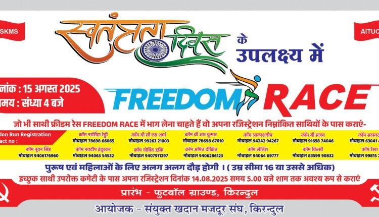 किरंदुल: लौह नगरी किरंदुल में गत वर्ष की भांति इस वर्ष भी 15 अगस्त को स्वतंत्रता दिवस के उपलक्ष्य में “संयुक्त खदान मजदूर संघ” (एस.के.एम.एस) द्वारा फ्रीडम रेस (हॉफ मैराथन) का भव्य आयोजन किया जा रहा है। 15 अगस्त दोपहर 4 बजे नगर के फुटबॉल ग्राउंड से यह रेस प्रारंभ होगी । एनएमडीसी किरंदुल परियोजना के अधिशासी निदेशक रविन्द्र नारायण द्वारा हरी झंडी दिखाकर रेस का शुभारंभ किया जाएगा। पूरे नगर का भ्रमण कर रेस का समापन भी फुटबॉल ग्राउंड में होगा। जिसमे पुरुष व महिला वर्ग को पृथक रूप से प्रथम पुरस्कार 15 हजार, द्रुतीय पुरस्कार 10 हजार, तृतीय पुरस्कार 7 हजार 500 रुपए दिया जाएगा। इनके अलावा इस रेस को पूरा करने वाले प्रथम 10 प्रतिभागियों को भी 1000- 1000 रुपये का पुरस्कार दिया जएगा। फ्रीडम रेस के संबंध में प्रेस को जानकारी देते हुए एस.के.एम.एस के कार्यकारी अध्यक्ष ने बताया कि श्रमिक संघ द्वारा आयोजित इस फ्रीडम रेस में हजारों की संख्या में नगर के महिला पुरूष हिस्सा लेते है। और इस नगर में मैराथन के प्रोफेशनल धावक न होते हुए भी इतनी बड़ी संख्या में इस मिनी मैराथन में लोगो का हिस्सा लेना देश भक्ति के जज्बे को दर्शाता है। प्रतिभागियों के लिए हार जीत व पुरस्कार मायने नही रखती। देश के आज़ादी का जज़्बा लिए सभी महिला पुरुष इस रेस 10 किलोमीटर की रेस को पूरा करते है। और हमे उम्मीद है कि इसी जज़्बे के साथ इस वर्ष भी हजारों की संख्या में लोग इस फ्रीडम रेस का हिस्सा बनेंगे।