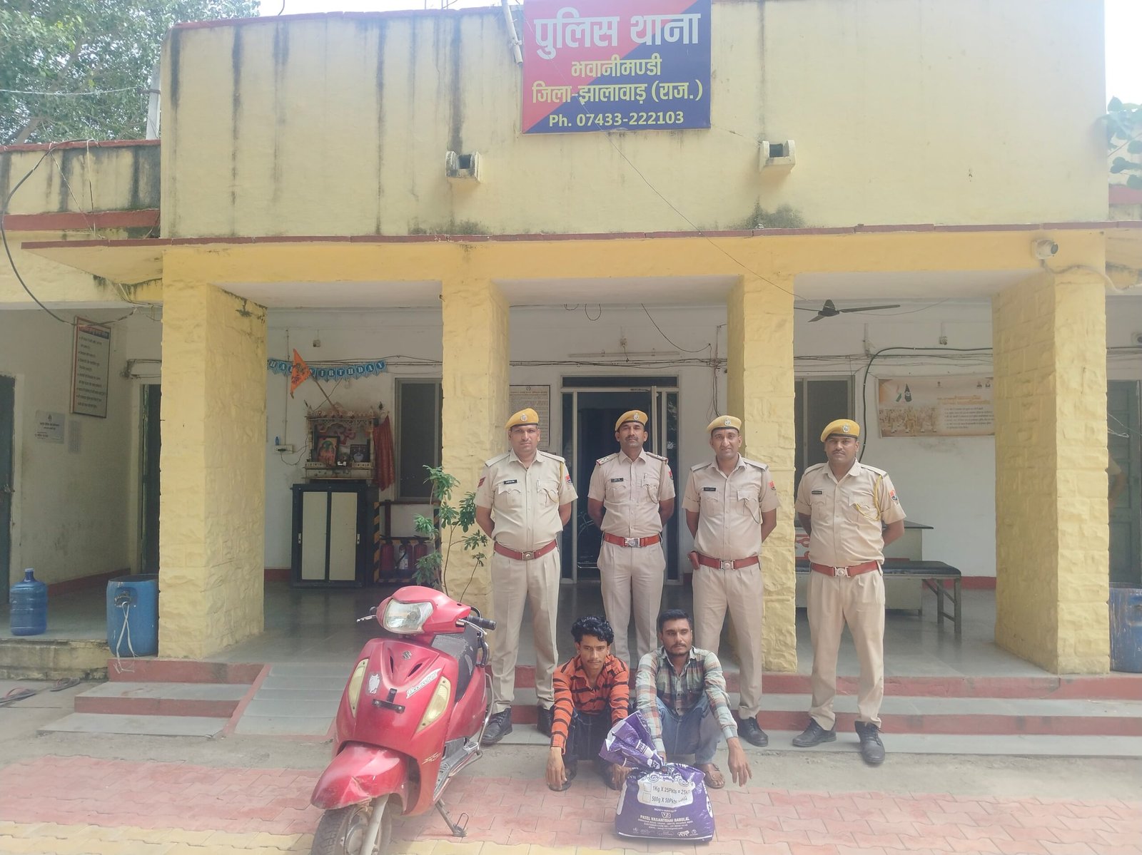 पुलिस अधिक्षक झालावाड़ अमित कुमार द्वारा जानकारी देते हुए बताया गया कि जिले के सभी थाना क्षेत्र के थाना अधिकारियों को अवैध शराब, अवैध मादक पदार्थो की तस्करी करनें वालों एवं अवैध हथियारों के विरुद्व प्रभावी कार्यवाही करनें के लिये निर्देश दिये गये थे जिसकी परिपालना में पुलिस थाना भवानीमण्ड़ी के द्वारा थाना हाजा पर विशेष टीम का गठन किया गया जिसके द्वारा कार्यवाही करते हुए गश्त के दौरान अवैध मादक पदर्थ की तस्करी करते हुए दो आरोपीयों को गिरफ्तार करनें में सफलता मिली। पुलिस अधिक्षक अमित कुमार एवं अति. पुलिस अधिक्षक चिरंजीलाल मीणा के निर्देशन एवं प्रेम कुमार आरपीएस वृत अधिकारी के मार्गदर्शन में थाना प्रभारी भवानी मण्ड़ी रमेश चंद्र मीणा द्वारा गठित दल द्वारा अवैध कार्यो की चेकिंग एवं रोकथाम में गश्त के दौरान प्रकाश भावसार 24 साल निवासी खोखरिया खुर्द पुलिस थाना पगारिया एवं विद्वान सिंह सोंधिया राजपूत 5 साल निवासी करावन पुलिस थाना थाना पगारिया जिला झालावाड़ को ं4 किलो 350 ग्राम अवैध मादक पदार्थ गांजा सहित गिरफ्तार करनें में सफलता मिली साथ ही मादक पदार्थ तस्कारी में प्रयुक्त वाहन स्कुटी एमएपी14एसई 3579 को जब्त किया गया। गश्त के दौरान भवानीमण्ड़ी रेल्वे स्टेशन के पास पीली कोठी भवानीमण्ड़ी से दोनों की तलाशी लेने पर स्कुटी पर दोनो के बीच रखे हुए कट्टे से ं4 किलो 350 ग्राम गाजा मिला।