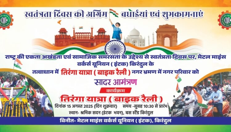 किरंदुल: देश अपना 79 वां स्वतंत्रता दिवस दिनांक 15 अगस्त 2025 को मनाने जा रहा है। आजादी के इस महापर्व के सुअवसर पर राष्ट्र की एकता अखंडता और सामाजिक समरसता के पावन उद्देश्य से मेटल माइंस वर्कर्स यूनियन (इंटक) शाखा किरंदुल के अध्यक्ष विनोद कुमार कश्यप और सचिव ए. के. सिंह के कुशल नेतृत्व एवं मार्गदर्शन में एवं नगर परिवार की गरिमामय उपस्थिति में तिरंगा यात्रा (बाईक रैली) का आयोजन किरंदुल नगर में कर रही है जिसमें बी आई ओ एम किरंदुल काम्प्लेक्स, एन एम डी सी प्रबंधन, नगर पालिका, पुलिस प्रशासन, सी आई एस एफ , किरंदुल के समस्त बैंक, समस्त विद्यालय, पोस्ट आफिस, अरसेलर मित्तल निप्पोन स्टील लिमिटेड, श्रम संगठन, व्यापारी संघ, बीटीओ, ठेकेदार एसोसिएशन , नगर के समस्त पत्रकार संघ , नगर के समस्त सामाजिक, सांस्कृतिक, प्रादेशिक, धार्मिक एवं नगर परिवार में सेवा देने वाले अनेकों सेवाभावी संस्थाओं के अध्यक्ष सचिव या प्रमुख पदाधिकारी, सदस्यों के साथ साथ बैलाडीला क्षेत्र के पूरे नगर परिवार को – “श्रमिको एवं नगरपरिवार के हितार्थ के लिए सदैव कार्य करने वाला श्रमिक संगठन मेटल माईंस वर्कर्स यूनियन (इंटक ) ने बड़े ही आदर और सम्मान के साथ सुबह 10 से दोपहर 12.30 बजे तक राष्ट्रीय पर्व के दिन अधिक संख्या में भागीदारी और गरिमामय उपस्थिति हेतु अपील, निवेदन भी की है। तिरंगा यात्रा (बाईक रैली) के माध्यम से दिनांक 15 अगस्त 2025 को सुबह 10.30 बजे श्रमिक सदन इंटक भवन ,बस स्टैंड किरंदुल से प्रारंभ होकर बस स्टैंड तिरंगा यात्रा (बाईक रैली) का समापन होगा। इस तिरंगा यात्रा (बाईक रैली) का शुभारंभ बी आई ओ एम किरंदुल काम्प्लेक्स के सम्माननीय अधिशासी निदेशक एवं इस कार्यक्रम के मुख्य अतिथि रविन्द्र नारायण तथा आमंत्रित विशिष्ट अतिथियों के कर कमलों से हरी झंडी दिखाकर तथा नगर परिवार की गरिमामय उपस्थिति में किया जायेगा तिरंगा यात्रा (बाईक रैली) नगर भ्रमण के दरम्यान देश भक्ति गाने और देश भक्ति नारा का गुंजन माईक आदि के माध्यम से होता रहेगा। यह राष्ट्रीय प्रेम और राष्ट्रीय एकता को प्रदर्शित करने वाला तिरंगा यात्रा (बाईक रैली) है । इंटक यूनियन ने नगर के समस्त संस्थाओं, प्रबुद्ध जनों नगर परिवार को इस यात्रा में सम्मिलित होने के लिए सादर निवेदन किया हैं।