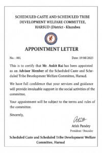 अनुसूचित जाति जनजाति विकास कल्याण समिति, हरसूद को यह घोषणा करते हुए हर्ष हो रहा है कि सामाजिक कार्यों एवं समाज उत्थान में सक्रिय भागीदारी को देखते हुए श्री अंकित राय जी (निवासी – नया हरसूद, जिला खंडवा) को समिति का सलाहकार सदस्य नियुक्त किया गया है।