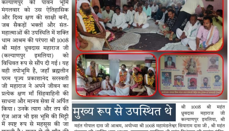 कल्याणपुर की पावन भूमि मंगलवार को उस ऐतिहासिक और दिव्य क्षण की साक्षी बनी, जब सैकड़ों भक्तों और संत-महात्माओं की उपस्थिति में शक्ति धाम आश्रम की परंपरा श्री 1008 श्री महंत ध्रुवदास महाराज जी (कल्याणपुर इमलिया) को विधिवत रूप से सौंप दी गई। यह वही तपोभूमि है, जहाँ ब्रह्मलीन परम पूज्य प्रकाशानंद सरस्वती जी महाराज ने अपने जीवन का प्रत्येक क्षण माँ सिंहवाहिनी की साधना और मानव सेवा में अर्पित किया। उनके त्याग और तप की गूंज आज भी इस भूमि की मिट्टी में स्पष्ट रूप से महसूस की जा सकती है। सुबह से ही गाँव की गलियों में श्रद्धालुओं का सैलाब उमड़ पड़ा। भव्य कलश यात्रा निकाली गई, जिसमें महिलाएँ, युवा और बच्चे उमंग और आस्था से सराबोर होकर सम्मिलित हुए। ढोल-नगाड़ों की थाप और गगनभेदी जयकारों से वातावरण भक्तिमय हो उठा। हर मोड़ पर फूलों और दीपों से स्वागत किया गया, और हृदयों में भक्ति की ज्वाला प्रज्वलित हो गई। समारोह में कई राज्यों और प्रदेशों से संत-महात्माओं ने भाग लिया।