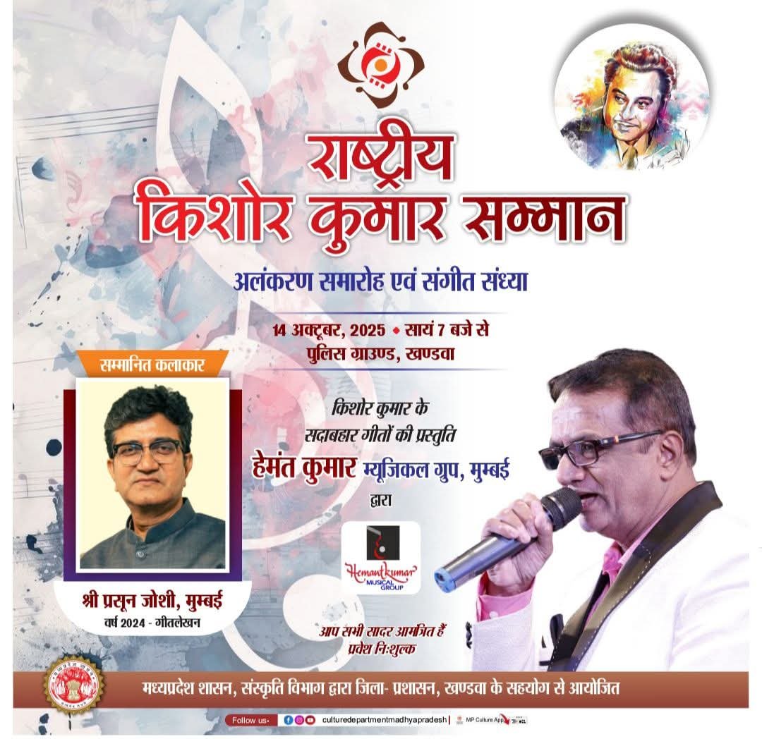संस्कृति विभाग द्वारा जिला प्रशासन,खंडवा के सहयोग से दो दिवसीय राष्ट्रीय किशोर कुमार सम्मान का आयोजन 13-14 अक्टूबर को पुलिस ग्राउंड, खंडवा में किया जाएगा। दोनों दिनों की प्रस्तुतियाँ शाम 7 बजे से संयोजित की जाएंगी। संचालक, संस्कृति श्री एन.पी. नामदेव ने बताया कि पहले दिन 13 अक्टूबर को स्थानीय किशोर गायकों द्वारा सुगम संगीत की प्रस्तुतियाँ होंगी। इसी दिन इंदौर के श्री अनिल शर्मा एवं बैंड श्रोताओं के लिए किशोर कुमार के यादगार नगमे पेश करेंगे।