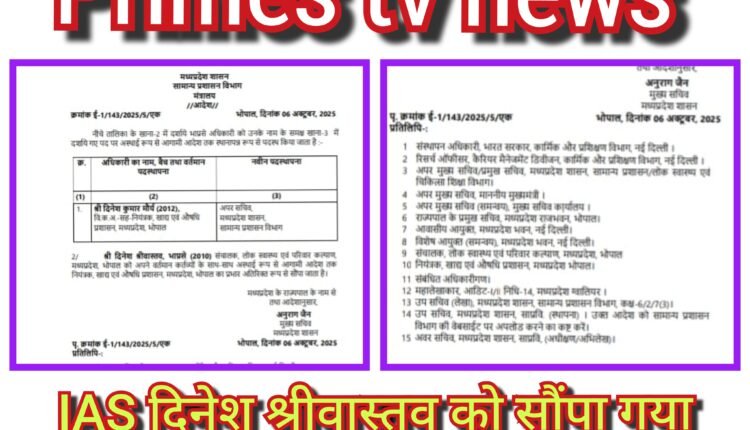 भोपाल। मध्यप्रदेश शासन ने प्रशासनिक फेरबदल के तहत वरिष्ठ IAS अधिकारी श्री दिनेश श्रीवास्तव (बैच 2010) को एक महत्वपूर्ण जिम्मेदारी सौंपी है। वे वर्तमान में संचालक, लोक स्वास्थ्य एवं परिवार कल्याण, मध्यप्रदेश के पद पर कार्यरत हैं। अब उन्हें नियंत्रक, खाद्य एवं औषधि प्रशासन (FDA), मध्यप्रदेश, भोपाल का अतिरिक्त प्रभार भी सौंपा गया है।