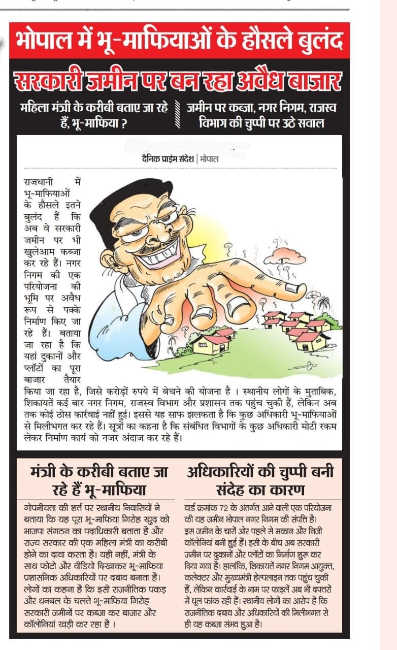 गोपनीयता की शर्त पर स्थानीय निवासियों ने बताया कि यह पूरा भू-माफिया गिरोह खुद को भाजपा संगठन का पदाधिकारी बताता है और राज्य सरकार की एक महिला मंत्री का करीबी होने का दावा करता है। यही नहीं, मंत्री के साथ फोटो और वीडियो दिखाकर भू-माफिया प्रशासनिक अधिकारियों पर दबाव बनाता है। लोगों का कहना है कि इसी राजनीतिक पकड़ और धनबल के चलते भू-माफिया गिरोह सरकारी जमीनों पर कब्जा कर बाजार और कॉलोनियां खड़ी कर रहा है ।