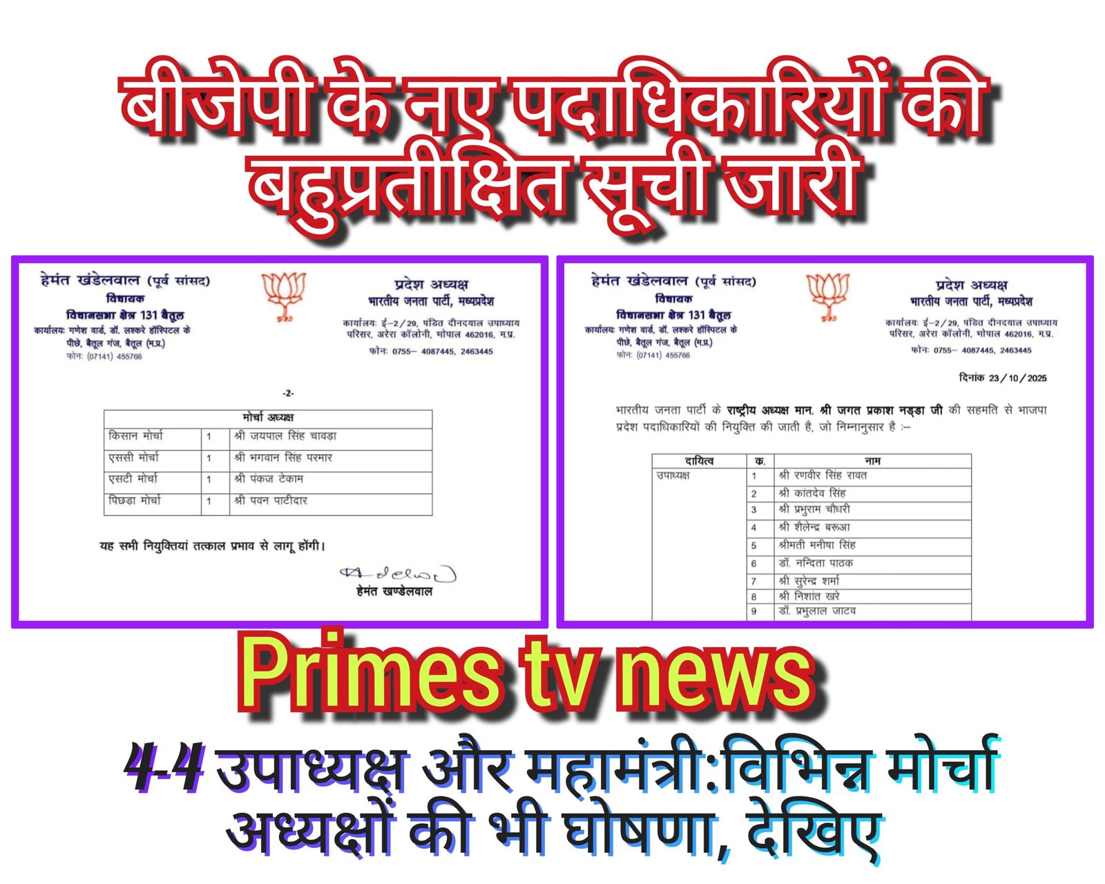 भोपाल।।लंबे इंतज़ार के बाद आखिरकार मध्यप्रदेश भारतीय जनता पार्टी की नई कार्यकारिणी की घोषणा हो गई है। प्रदेश भाजपा अध्यक्ष हेमंत खंडेलवाल ने अपने कार्यकाल के करीब साढ़े तीन महीने बाद इस बहुप्रतीक्षित सूची को जारी किया। नई कार्यकारिणी में संगठनात्मक संतुलन और क्षेत्रीय प्रतिनिधित्व को ध्यान में रखते हुए जिम्मेदारियों का बंटवारा किया गया है।