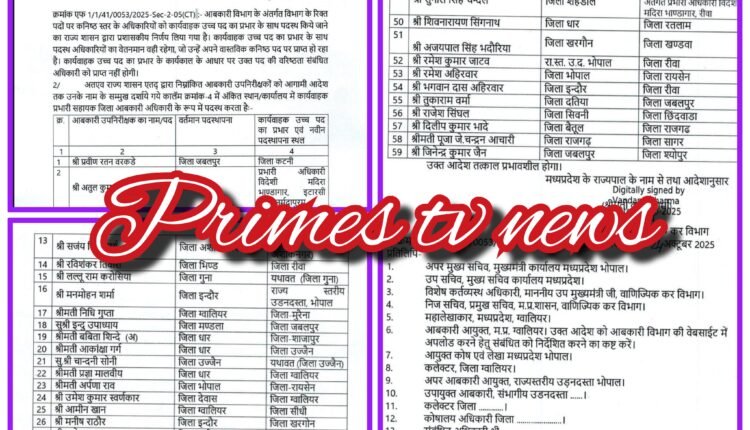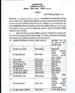 वाणिज्यिक कर विभाग, मंत्रालय, वल्लभ भवन, भोपाल से शुक्रवार को जारी आदेश (क्रमांक एफ 1/1/41/0053/2025-Sec-2-05(CT)) के अनुसार, इन अधिकारियों को उनके नाम के सामने दर्शाए गए जिले या कार्यालय में कार्यवाहक सहायक जिला आबकारी अधिकारी के रूप में आगामी आदेश तक पदस्थ किया गया है।