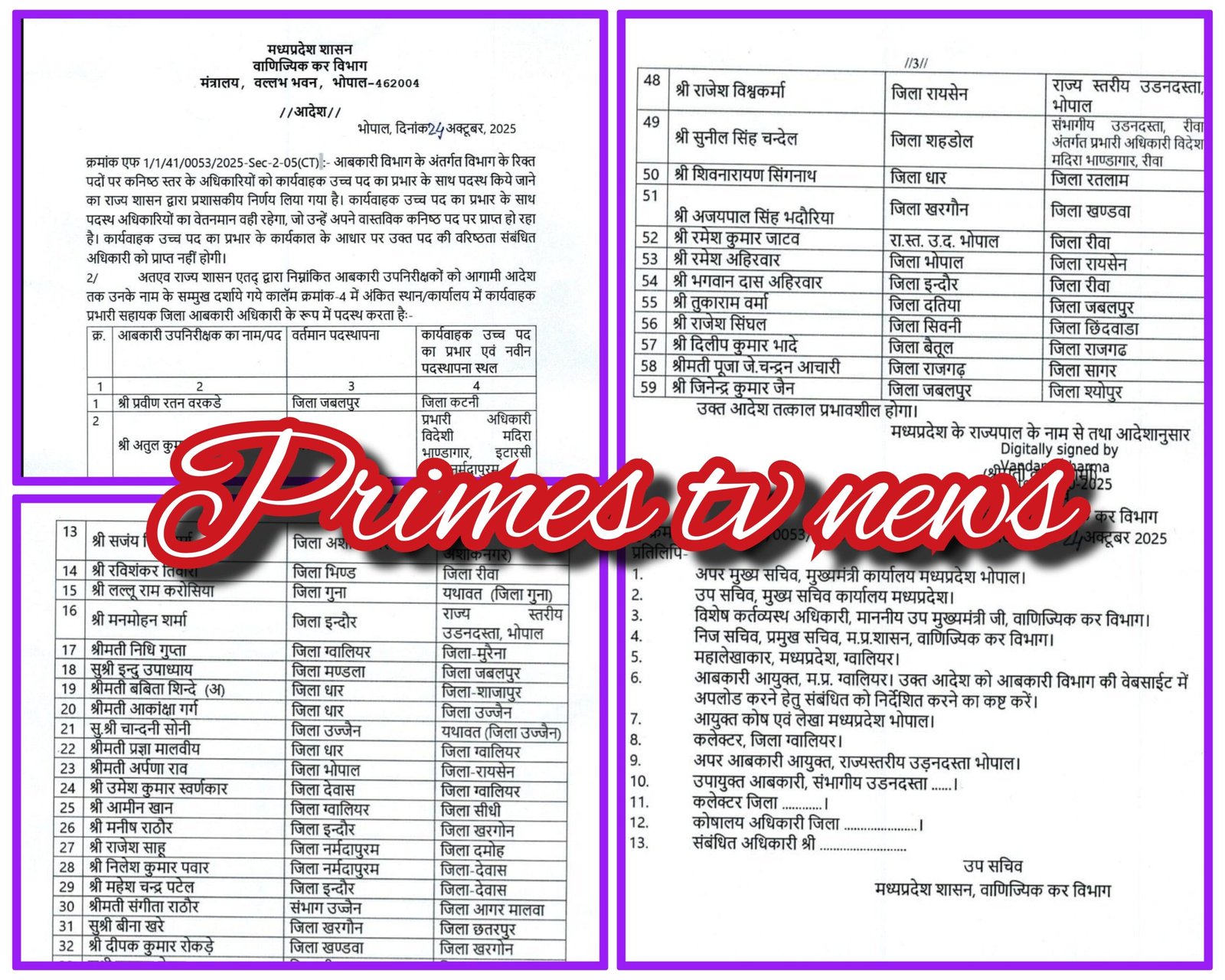 वाणिज्यिक कर विभाग, मंत्रालय, वल्लभ भवन, भोपाल से शुक्रवार को जारी आदेश (क्रमांक एफ 1/1/41/0053/2025-Sec-2-05(CT)) के अनुसार, इन अधिकारियों को उनके नाम के सामने दर्शाए गए जिले या कार्यालय में कार्यवाहक सहायक जिला आबकारी अधिकारी के रूप में आगामी आदेश तक पदस्थ किया गया है।