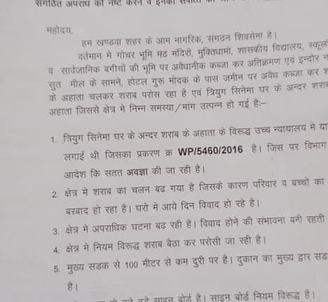 खंडवा । शहर के अनेक स्थानों पर अवैध शराब आहते खुलेआम संचालित किए जा रहे हैं इसको लेकर शिवसेना प्रमुख गणेश भावसार ने जनसुनवाई में जिला कलेक्टर ऋषभ गुप्ता को शिकायती पत्र सौंपा । शिकायती पत्र के साथ ही शहर के नागरिकों के आक्रोशित होते हुए वीडियो बाईट की एक सीडी भी जनसुनवाई में दी।