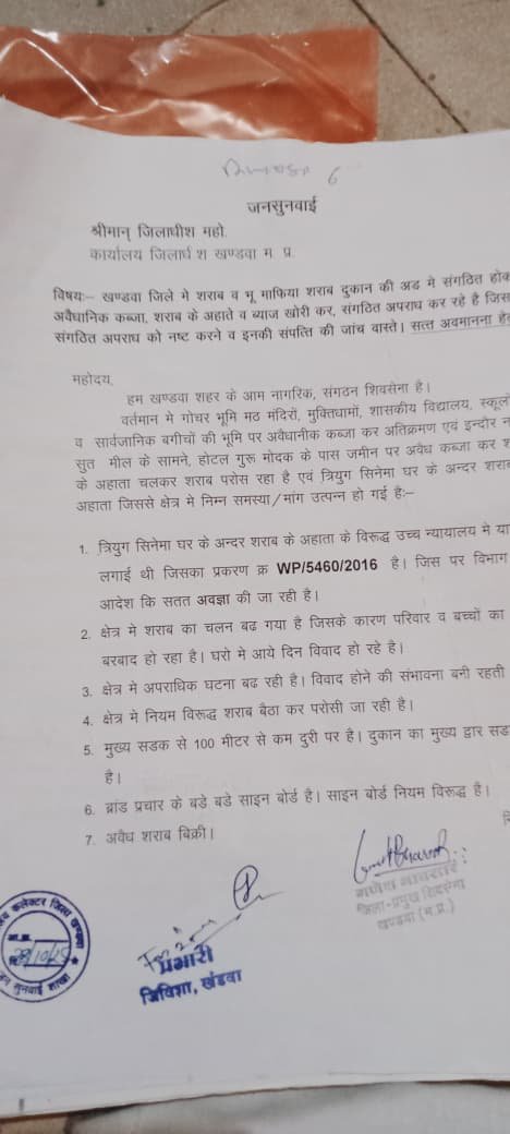 खंडवा । शहर के अनेक स्थानों पर अवैध शराब आहते खुलेआम संचालित किए जा रहे हैं इसको लेकर शिवसेना प्रमुख गणेश भावसार ने जनसुनवाई में जिला कलेक्टर ऋषभ गुप्ता को शिकायती पत्र सौंपा । शिकायती पत्र के साथ ही शहर के नागरिकों के आक्रोशित होते हुए वीडियो बाईट की एक सीडी भी जनसुनवाई में दी।