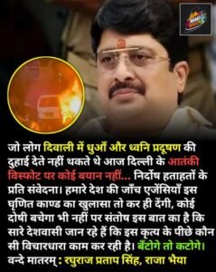 कुंडा प्रतापगढ़: देश की राजधानी दिल्ली में सोमवार शाम लाल किला मेट्रो स्टेशन के पास हुए ब्लास्ट में कई लोगों के मारे जाने की पुष्टि हुई है। इन मृतकों में यूपी के 4 लोग शामिल हैं। दिल्ली धमाके के बाद सुरक्षा एजेंसियां हाई अलर्ट पर हैं। जांच एजेंसियां घटना की तहकीकात में जुटी हुई हैं।फॉरेंसिक अधिकारियों ने घटनास्थल से सैंपल इकट्ठा कर उन्हें जांच के लिए लैब भेजा है। जनसत्ता दल लोकतांत्रिक के राष्ट्रीय अध्यक्ष पूर्व कैबिनेट मंत्री कुंडा विधायक कुंवर रघुराज प्रताप सिंह राजा भइया ने इस ब्लास्ट को लेकर तीखा बयान दिया है। उन्होंने कहा कि जो लोग दिवाली में धुआं और ध्वनि प्रदूषण की दुहाई देते नहीं थकते थे, आज दिल्ली के आतंकी विस्फोट पर कोई बयान नहीं राजा भइया ने निर्दोष हताहतों के प्रति संवेदना व्यक्त की और कहा कि हमारे देश की जांच एजेंसियां इस घृणित काण्ड का खुलासा तो कर ही देंगी, कोई दोषी बचेगा भी नहीं पर संतोष इस बात का है कि सारे देशवासी जान रहे हैं कि इस कृत्य के पीछे कौन सी विचारधारा काम कर रही है। उन्होंने देश की जांच एजेंसियों पर विश्वास जताते हुए कहा कि वे दोषियों को सजा दिलाएंगी। राजा भइया का यह बयान सोशल मीडिया पर वायरल हो रहा है और लोग उनके समर्थन में अपनी प्रतिक्रियाएं दे रहे हैं। लोगों ने राजा भइया के बयान को देशभक्ति और निडरता का प्रतीक बताया है।