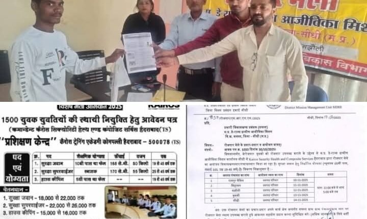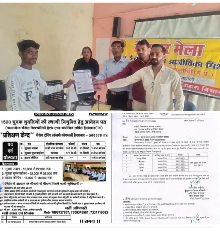 युवाओं को ज्यादा से ज्यादा रोजगार मुहैया कराया जा सके इसको लेकर मध्य प्रदेश शासन के निर्देशानुसार मध्य प्रदेश डे आजीविका मिशन के द्वारा राष्ट्रीय स्तर की कंपनियों के सहभागिता से प्रदेश भर में रोजगार मेला आयोजित किया जा रहा है। जहां अर्ध शासकीय रजिस्टर्ड कंपनियों में युवाओं को रोजगार मुहैया कराया जा रहा है इसी कड़ी में सीधी जिले के मझौली जनपद पंचायत के प्रज्ञा भवन में आजीविका मिशन के देख- रेख में आज 12 नवंबर को रोजगार मेला आयोजित किया गया जहां पर भारतीय सुरक्षा कंपनी में आठ सुरक्षा जवानों का चयन किया गया है।
