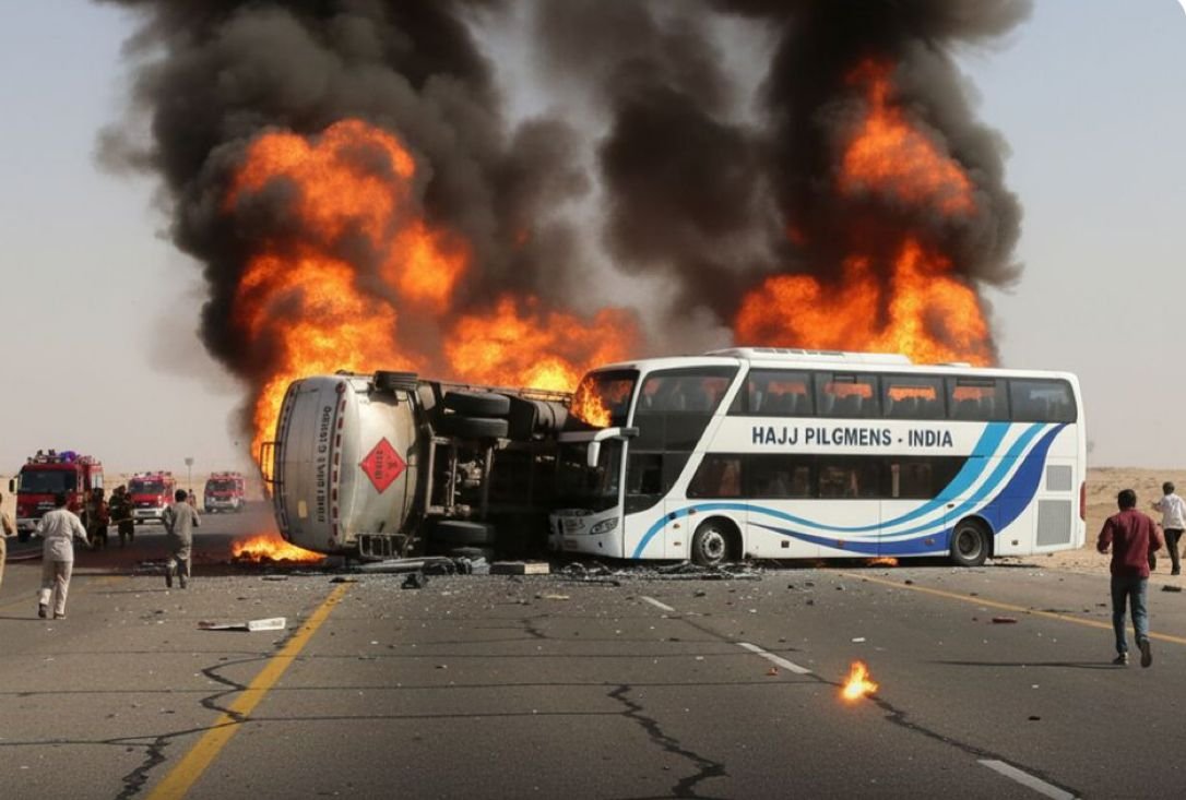 मक्का (सऊदी अरब)एक दुखद और दर्दनाक हादसा उस वक्त सामने आया है जब उमरा के लिए सऊदी अरब गए भारतीय तीर्थयात्रियों की एक बस मक्का से मदीना की ओर जा रही थी, और उसमें डीज़ल टैंकर के साथ टकराव के बाद आग लग गई। प्रारंभिक रिपोर्टों में कहा जा रहा है कि इस दुर्घटना में कम-से-कम 42 भारतीय तीर्थयात्रियों के मारे जाने का डर है।