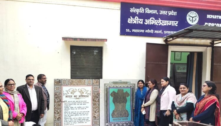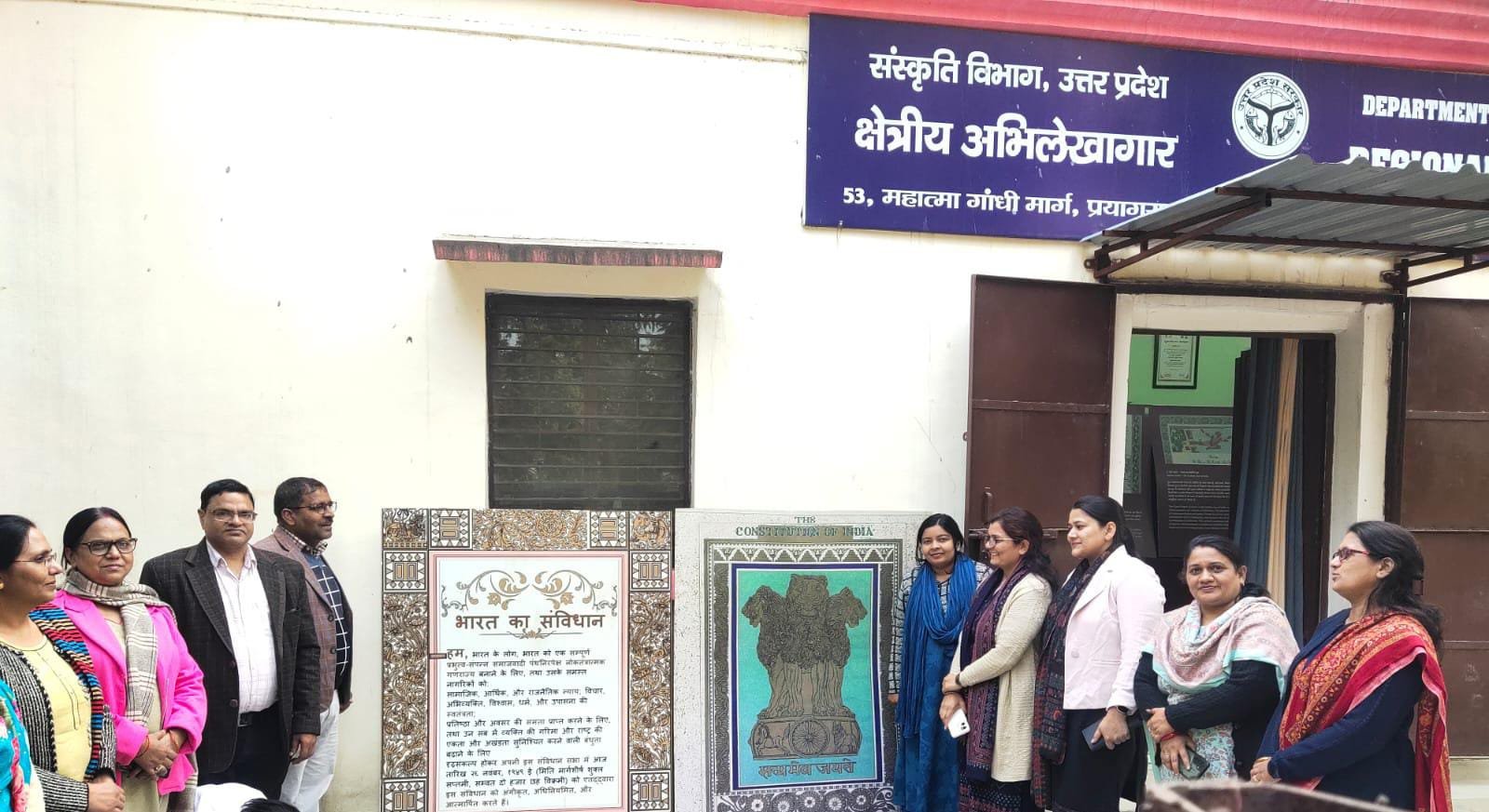 भारतीय संविधान दिवस के अवसर पर संविधान पर आधारित प्रदर्शनी का आयोजन क्षेत्रीय अभिलेखागार, संस्कृति विभाग उ0प्र0 एवं जिला प्रशासन प्रयागराज के संयुक्त तत्वावधान मे कार्यालय क्षेत्रीय अभिलेखागार प्रयागराज में किया गया। इस प्रदर्शनी में संविधान की प्रस्तावना, संविधान का निर्माण, भारतीय संविधान में चित्रण-एक सांस्कृतिक यात्रा, संविधान का गौरव और विरासत आदि से सम्बन्धित प्रदर्श को प्रस्तुत किया गया। सभी का स्वागत प्रभारी, क्षेत्रीय अभिलेखागार, श्री गुलाम सरवर के द्वारा किया गया।कार्यक्रम का संयोजन श्री राकेश कुमार वर्मा, प्राविधिक सहायक, इतिहास द्वारा किया गया और आये हुए आगुन्तको को भारत के संविधान के बारे मे बताया। इस अवसर पर श्री रवीन्द्र नाथ, सहायक निदेशक, पत्राचार, श्रीमती सीमा सिंह, मंशा सिंह, रीता यादव, कीर्ति पटेल, प्रिंयंका यादव, सना सिद्दकी, सुमन यादव, दीपिका सिंह एवं नीलम जी की गरिमामयी उपस्थिति रही। कार्यक्रम में श्री विकास यादव, वरिष्ठ सहायक, शुभम कुमार की उपस्थिति रही।