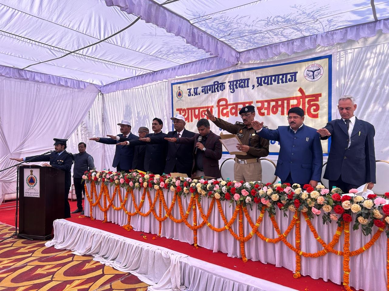 प्रयागराज: नागरिक सुरक्षा विभाग के 63 वे स्थापना दिवस कार्यक्रम का आयोजन हर्षोल्लास के साथ नागरिक सुरक्षा कार्यालय, कटरा रोड पर आयोजित किया गया, जिसमें मुख्य अतिथि जिलाधिकारी एवं नियंत्रक नागरिक सुरक्षा मनीष कुमार वर्मा द्वारा ध्वजोतोलन किया गया एवं राष्ट्रगान के उपरांत मुख्य अतिथि द्वारा बचाव उपकरणों की प्रदर्शनी का अवलोकन किया गया तत्पश्चात उपस्थित समस्त सदस्य एवं स्वयंसेवकों को नागरिक सुरक्षा अधिनियम 1968 एवं निर्गत नियम एवं शासनादेश का अनुपालन हेतु मुख्य अतिथि द्वारा शपथ दिलायी गयी, इसके पश्चात महामहिम राष्ट्रपति महोदय द्वारा प्राप्त संदेश का वाचन जिलाधिकारी एवं नियंत्रक नागरिक सुरक्षा मनीष कुमार वर्मा द्वारा किया गया, कार्यक्रम में उपस्थित पुलिस उपायुक्त (मुख्यालय) पंकज पांडेय द्वारा माननीय प्रधानमंत्री जी द्वारा प्रेषित संदेश का वाचन किया गया विभाग की स्थापना दिवस के अवसर पर केंद्रीय गृह मंत्री ,केंद्रीय गृह सचिव , पुलिस महानिदेशक नागरिक सुरक्षा, होमगार्डस, अग्निशमन सेवा नई दिल्ली द्वारा तथा निदेशक, नागरिक सुरक्षा उत्तर प्रदेश लखनऊ द्वारा प्रेषित संदेशों को भी अतिथियों द्वारा पढ़कर सभी को सुनाया गया, नागरिक सुरक्षा के 250 स्वयंसेवकों द्वारा जन जागरूकता रूट मार्च को मुख्य अतिथि द्वारा हरी झंडी दिखाकर शुभारंभ किया गया जो कि कचहरी चौराहे से प्रारंभ होकर लक्ष्मी टॉकीज चौराहा से कटरा रोड नेतराम चौराहे होते हुए पुनः नागरिक सुरक्षा कार्यालय में आकर समाप्त हुई|