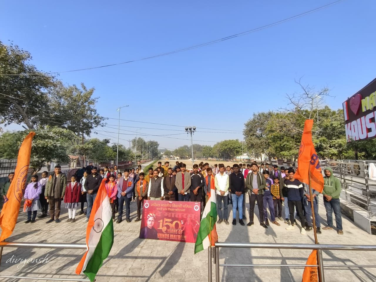 कौशाम्बी: अखिल भारतीय विद्यार्थी परिषद कौशाम्बी जिले का कार्यकर्ताओं द्वारा वंदे मातरम के 150वीं वर्षगांठ पर गुरुवार को मंझनपुर स्थित डायट मैदान में सैकड़ो विद्यार्थियों कार्यकर्ताओं के साथ एक स्वर में सामूहिक वंदे मातरम गीत गाकर जिले में राष्ट्रभक्ति का संदेश दिया। तत्पश्चात कार्यकर्ताओं ने सैकड़ो की संख्या में वंदे मातरम के उद्घोष के साथ साइकिल यात्रा निकालकर नगर में संदेश राष्ट्र भक्ति का संदेश दिया ।मुख्य अतिथि के रूप में जिला विद्यालय निरीक्षक राजेश कुमार सिंह ने साइकिल यात्रा को झंडी दिखाकर रवाना किया जिला विद्यालय निरीक्षक ने विद्यार्थियों को संबोधित करते हुए कहा कि वंदे मातरम गीत गाते -गाते आजादी के समय न जाने कितने महापुरुषों ने हंसते-हंसते फांसी पर चढ़ गए हम सभी का यह कर्तव्य हैं की वंदे मातरम का अलख जिले भर में प्रत्येक विद्यार्थियों के हृदय में जागने का कार्य करें। जिला संयोजक शिवांशु शुक्ला ने बताया कि जब-जब राष्ट्रवाद की बात आती है तब तब अखिल भारतीय विद्यार्थी परिषद इसके लिए आगे खड़ी होती है। इस कड़ी में वंदे मातरम के 150 वर्ष पूर्ण होने पर जिले भर में ऐसे महाविद्यालय इंटर कॉलेज में अखिल भारतीय विद्यार्थी परिषद के कार्यकर्ता विद्यार्थियों के साथ मिलकर के सामूहिक वंदे मातरम का गायन करेंगे ।वंदे मातरम् गीत अपने मातृ भूमि की वंदना है इसको प्रतिदिन प्रत्येक नागरिक को करना चाहिए। विद्यार्थियों के अन्दर राष्ट्र भक्ति का भाव जगाना अखिल भारतीय विद्यार्थी परिषद का मूल कर्तव्य है ।प्रदेश कार्यकारिणी सदस्य सुशील सोनकर ने कहा यह पल हम सभी कार्यकर्ताओं और विद्यार्थियों के लिए गौरव का पल है । जो वंदेमातरम् के 150वीं वर्षगांठ पर सामुहिक वंदेमातरम् गाने का अवसर प्राप्त हो रहा है विद्यार्थीयों के अन्दर भी वंदेमातरम् को लेकर काफी उत्साह देखने को मिल रहा है ।इस दौरान जिला संयोजक शिवांशु शुक्ला ,तहसील संयोजक सुशील सोनकर, तहसील सह संयोजक दिव्यांश द्विवेदी, नगर उपाध्यक्ष धीरेंद्र शुभम पाल आयुष द्विवेदी छोटू प्रजापति नगर मंत्री मंझनपुर दीपक राजपूत पूर्व इकाई अध्यक्ष गौरव मिश्रा टेवां नगर मंत्री अमित द्विवेदी मनीष नामदेव आषीस शुक्ला नगर सह मंत्री वंश सिंह आयुष सिंह पूजा निर्मल प्रेक्षा मिश्रा कविता कोमल प्रतिभा प्रतिमा पाल आस्था जागृति स्वाती विनीता आर्तिका यादव प्रिया मौर्य अमन मनीष पंकज शिवा कुलदीप साहिल लवकुश आरती देवी कुशुम वन्दना सहित सैकड़ो विद्यार्थी कार्यकर्ता उपस्थित रहे ।