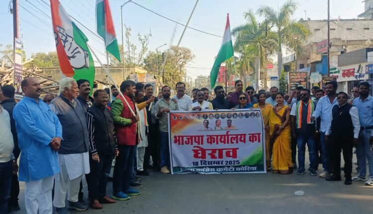 बैकुंठपुर जिला कोरिया। नेशनल हेराल्ड मामले में प्रवर्तन निदेशालय (ईडी) द्वारा दर्ज एफआईआर को अदालत द्वारा रद्द किए जाने को “सत्य की जीत” बताते हुए आज कांग्रेस पार्टी ने बैकुंठपुर में भाजपा कार्यालय का घेराव किया।
