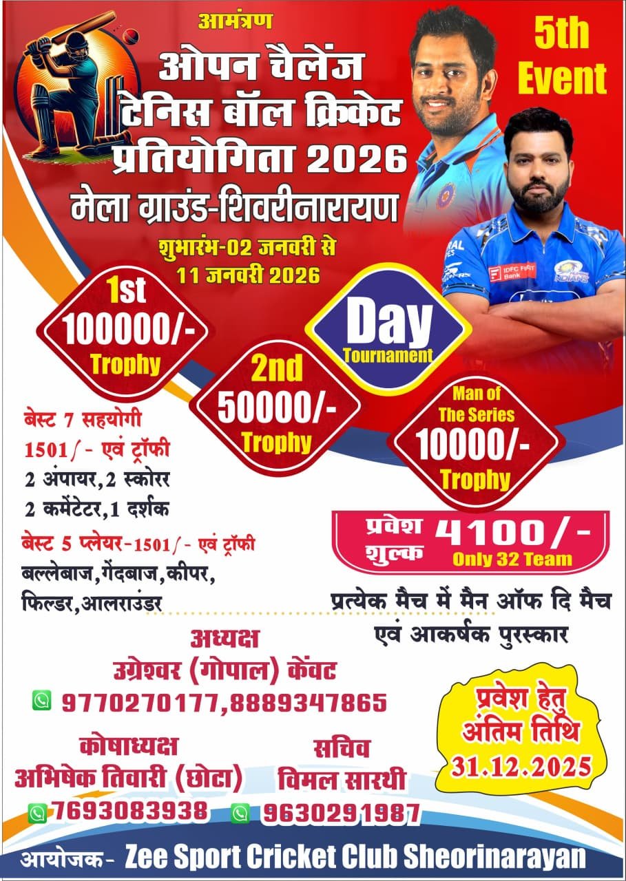 नववर्ष 2026 के पावन अवसर पर मेला ग्राउंड शिवरीनारायण में ओपन चैलेंज टेनिस बॉल क्रिकेट टूर्नामेंट का भव्य आयोजन जी स्पोर्ट्स क्रिकेट क्लब के तत्वाधान 2 जनवरी से 10 दिवसीय प्रतियोगिता 11 जनवरी तक आयोजित है यह प्रतियोगिता डे क्रिकेट फॉर्मेट में खेली जाएगी।