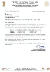 यह जानकारी CBSE के परीक्षा नियंत्रक डॉ. संयम भारद्वाज द्वारा 29 दिसंबर 2025 को जारी की गई अधिसूचना में दी गई है।