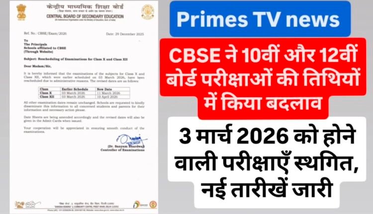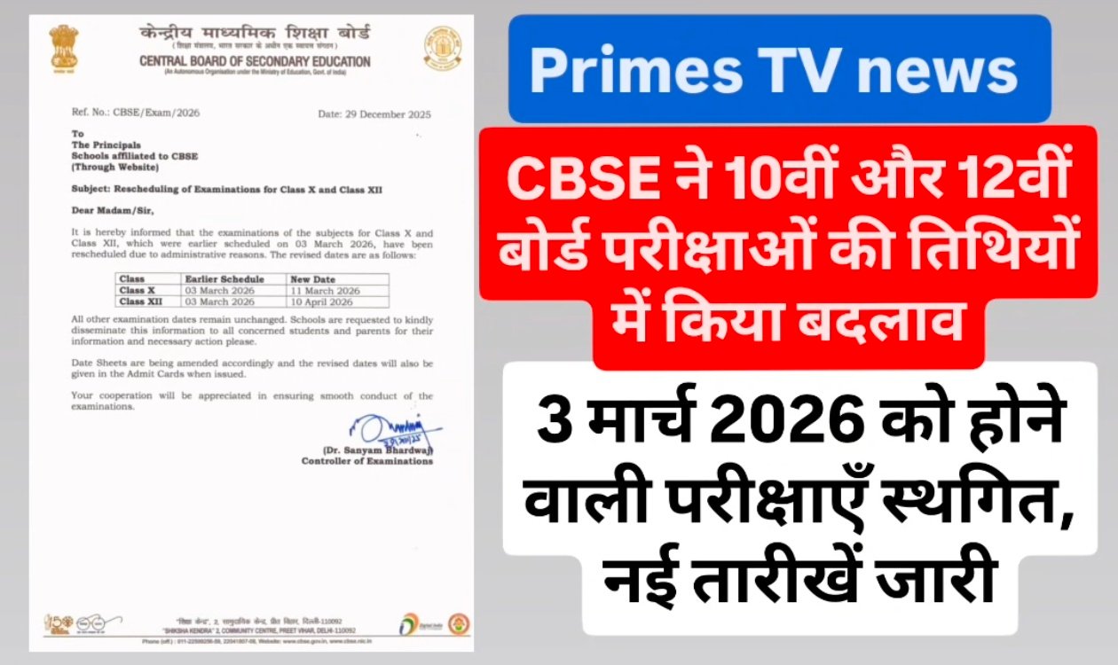 भोपाल::केंद्रीय माध्यमिक शिक्षा बोर्ड (CBSE) ने कक्षा 10वीं और 12वीं की बोर्ड परीक्षाओं की तिथियों में बदलाव किया है। बोर्ड द्वारा जारी आधिकारिक सूचना के अनुसार प्रशासनिक कारणों से 3 मार्च 2026 को आयोजित होने वाली परीक्षाओं को पुनर्निर्धारित किया गया है।