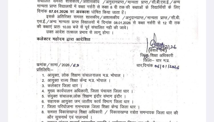 जारी आदेश के अनुसार धार जिलान्तर्गत संचालित समस्त शासकीय, अशासकीय, अनुदानप्राप्त, मान्यता प्राप्त, सी.बी.एस.ई. एवं अन्य मान्यता प्राप्त विद्यालयों में कक्षा नर्सरी से कक्षा 8वीं तक के विद्यार्थियों के लिए दिनांक 07 जनवरी 2026 को अवकाश घोषित किया गया है।