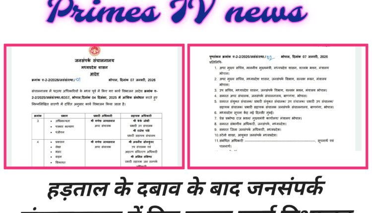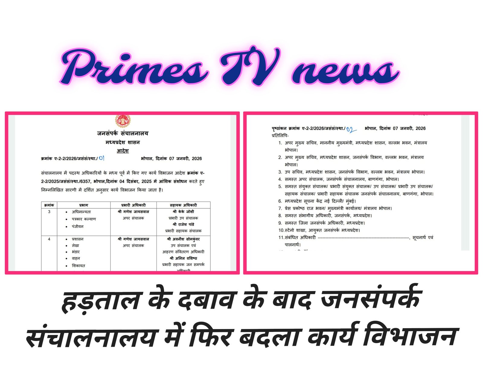 भोपाल।मध्य प्रदेश जनसंपर्क संचालनालय में एक बार फिर कार्य विभाजन में बदलाव किया गया है। कर्मचारियों द्वारा हाल ही में किए गए विरोध और हड़ताल के बाद शासन ने यह कदम उठाया है। जनसंपर्क संचालनालय, मध्यप्रदेश शासन द्वारा 07 जनवरी 2026 को संशोधित आदेश जारी कर अधिकारियों के बीच जिम्मेदारियों का पुनः निर्धारण किया गया।