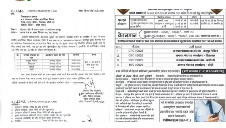 बेरोजगार युवकों को रोजगार मुहैया कराए जाने के उद्देश्य से मध्य प्रदेश डे राज्य आजीविका मिशन जिला सीधी द्वारा संपन्न कराए जा रहे रोजगार मेलें का आयोजन ब्लॉक स्तरों पर जारी है। इसी क्रम में कल 9 जनवरी 2026 दिन शुक्रवार को मझौली ब्लाक के जनपद कार्यालय प्रांगण स्थित प्रज्ञा भवन में मेले का आयोजन नियत किया गया है। प्रबंधक चंद्रकांत सिंह द्वारा जानकारी देते हुए बताया गया है कि बेरोजगार युवकों को रोजगार मुहैया कराए जाने शासन के उद्देश्य को दृश्यगत रखते हुए जिला प्रशासन तथा मुख्य कार्यपालन अधिकारी जिला पंचायत सीधी के निर्देशन व जिला प्रबंधक मध्य प्रदेश डे अजीविका मिशन, एवं मुख्य कार्यपालन अधिकारी जनपद पंचायत मझौली के मार्गदर्शन में कल 9 जनवरी को प्रज्ञा भवन मझौली में सुबह 11बजे से साम 5 बजे तक सुरक्षा जवान भर्ती शिविर आयोजित की जा रही है।क्षेत्र के सभी ऐसे बेरोजगार युवक जो आठवीं से लेकर अधिक योग्यता धारी हैं वह अपने दस्तावेजों के साथ प्रज्ञा भवन में उपस्थित हो रोजगार के अवसर प्राप्त करते हैं। अधिकारियों, कर्मचारियों, जनप्रतिनिधियों समाजसेवियों के साथ क्षेत्र के वर्तमान नागरिकों एवं मीडिया से अपील है कि उक्त मिला आयोजन की जानकारी क्षेत्र में देते हुए ज्यादा से ज्यादा बेरोजगार युवकों को प्रेरित कर शिविर में भेजें।