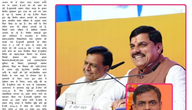 कौटिल्य के इस मंत्र को आत्मसात करते हुए भाजपा की डॉ मोहन यादव सरकार प्रगति पथ पर अग्रसर है।अर्थ तंत्र को उन्नत कर रही है।मुख्यमंत्री डाक्टर मोहन यादव के कुशल वित्तीय सुप्रबंधन द्वारा राज्य का अर्थ तंत्र उन्नत हो रहा है, सशक्त हो रहा है।वित्त विभाग द्वारा श्रेष्ठ वित्तीय प्रबंधन मानकों को अपनाकर शून्य आधारित बजट प्रक्रिया के अनुसार बजट तैयार किया जा रहा है। तीन वर्षों के लिये रोलिंग बजट की प्रक्रिया अपनाई गई है, जिसमें बजट प्रक्रिया से संबंधित नवाचार अपनाएं जा रहे हैं। वित्तीय संस्थाओं द्वारा जारी प्रतिवेदनों में मध्यप्रदेश के वित्तीय प्रबंधन,बजटीय विश्वसनीयता तथा गुणवत्ता को सराहा गया है।दूरदर्शी मुख्यमंत्री डॉ मोहन यादव ने 5 वर्षों में बजट के आकार को दोगुना कर वर्ष 2028-29 तक 7 लाख करोड़ रुपये करने का लक्ष्य निर्धारित किया है।पूंजीगत निवेश को बढ़ाना,सड़क विस्तार एवं संधारण, सिंचाई क्षेत्रफ़ल जल संचय क्षमता विस्तारण,बिजली,सौर,पवन ऊर्जा उत्पादन,वितरण सुविधा का विस्तार, गुणवत्तापूर्ण स्वास्थ्य सुविधाएं, शिक्षा का विकास और उद्योग,रोजगार के अवसर वृद्धि हेतु,निवेश आकर्षित करने आदि के लक्ष्यों को पूर्ण कर,विकसित भारत निर्माण के परम लक्ष्य में योगदान देना है।मुख्यमंत्री डॉ मोहन यादव द्वारा प्रदेश में पूंजीगत व्यय में निरंतर, सतत वृद्धि की जा रही है।पूंजीगत व्यय से राज्य के इन्फ्रास्ट्रक्चर, अवसंरचना में गुणात्मक वृद्धि हुई है।वित्त वर्ष 2025-26 के लिए पूंजीगत व्यय,केपिटल एक्सपेंडिचर लगभग 85 हजार करोड़ रुपये का प्रावधान किया गया है।प्रभावी पूंजीगत व्यय लगभग 90 हजार करोड़ रुपये है।प्रदेश के सकल घरेलू उत्पाद में नियमित वृद्धि बनी हुई है।वर्ष 2024-25 में प्रदेश का सकल राज्य घरेलू उत्पाद 15 लाख 03 हजार 395 करोड़ रूपये रहा एवं प्रति व्यक्ति आय 1 लाख 52 हजार 615 रूपये रही है।वर्तमान वित्त वर्ष में राज्य का सकल घरेलू उत्पाद लगभग 17 लाख करोड़ रुपये होने का अनुमान है।