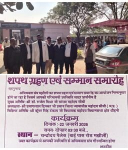 अधिवक्ता संघ मझौली द्वारा नगर परिषद मझौली वार्ड क्रमांक 4 स्थित चंद्रोदय पैलेस बायपास रोड में कल 22 जनवरी 2026 दिन गुरुवार को शाम 3:30 बजे से सीधी – सिंगरौली सांसद डॉक्टर राजेश मिश्रा के मुख्य आतिथ्य व प्रधान जिला न्यायाधीश सीधी