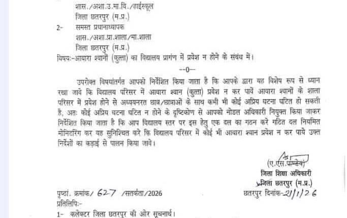 जिला शिक्षा अधिकारी छतरपुर ने जिले के सभी स्कूल प्राचार्यों के लिए एक आदेश जारी किया है। नए निर्देशों के अनुसार, अब स्कूल परिसरों में आवारा कुत्तों के प्रवेश पर कड़ी निगरानी रखनी होगी।