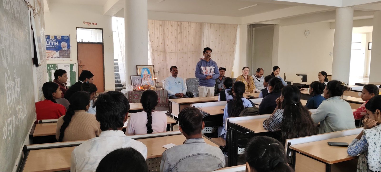* मध्य प्रदेश शासन उच्च शिक्षा विभाग द्वारा जारी भारतीय ज्ञान परंपरा के अंतर्गत त्रैमासिक कैलेंडर के अनुसार महाविद्यालय में बसंत पंचमी के शुभ अवसर पर माता सरस्वती का पूजन अर्चन कर सुभाष चंद्र बोस की जयंती मनाई गई कार्यक्रम में प्राचार्य डॉक्टर साहेबराव झरबडे सहित पूरा स्टाफ माता सरस्वती का पूजन अर्चन कर सुभाष चंद्र बोस के छायाचित्र पर पुष्प अर्पित किया इस अवसर पर महाविद्यालय की छात्रा रोशनी धुर्वे एवं साथियों ने लोक नृत्य प्रस्तुत किया साथ ही बसंत पंचमी के अवसर पर व्याख्यान माला का आयोजन हुआ जिसमें महाविद्यालय के प्राचार्य डॉक्टर साहेब राव झरबडे ने बसंत पंचमी के महत्व को बताते हुए भारतीय ज्ञान परंपरा के उद्देश्यों से छात्रों को अवगत कराया महाविद्यालय के मीडिया सेल प्रभारी प्रो. हेमंत कुमार निरापुरे ने सुभाष चंद्र बोस के जीवन और उनके संघर्षों को याद किया प्रो.ओम प्रकाश बोरकर ने नेताजी सुभाष चंद्र बोस के योगदान से बच्चों को अवगत कराया भारतीय ज्ञान परंपरा के नोडल अधिकारी डॉ अजय कुमार चौबे ने बसंत पंचमी के अवसर पर पर्यावरण के बदलाव एवं भारतीय ज्ञान परंपरा के परिदृश्य से इसकी विशेषताओं को बताया।कार्यक्रम का संचालन डॉ अजय कुमार चौबे ने किया एवं आभार प्रदर्शन छात्रा स्नेहा रेवतकर ने व्यक्त किया कार्यक्रम में डॉ. यासमीन जिया प्रो. सुरभि उईके डॉ.देवकृष्ण मगरदे डॉ. भूपेंद्र पाटनकर डॉ. दामोदर झारे डॉ राजेश आर्य श्री रत्नेश जैन श्री मोहित भोपते श्रीमती भूमिका भोपते शोभा मगरदे प्रकाश झरबडे आशीष काजोडे सौरभ कहार आकाश प्रजापति रामभगत यादव मनीष मालवीय दीपक खातरकर सहित महाविद्यालय के छात्राएं उपस्थित रहे