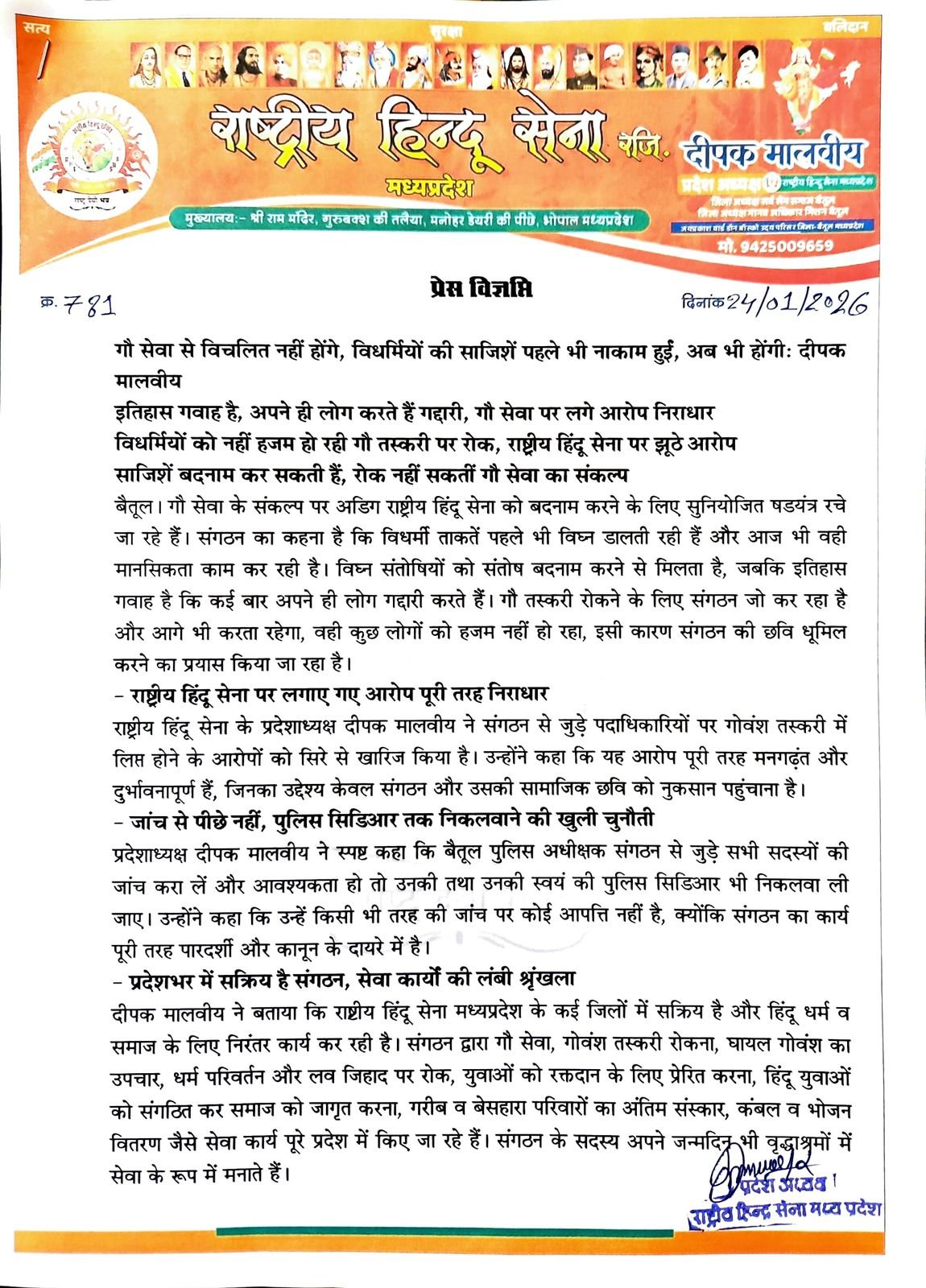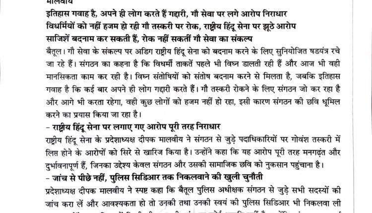 दीपक मालवीय ने कहा कि गोवंश तस्करी पर लगातार कार्रवाई से कुछ अन्य संगठनों से जुड़े बड़े पदाधिकारी नाराज हैं। यही कारण है कि बैतूल में संगठन के पदाधिकारियों और राष्ट्रीय हिंदू सेना को बार-बार व्यक्तिगत रूप से टार्गेट कर बदनाम किया जा रहा है।