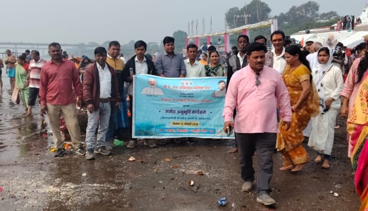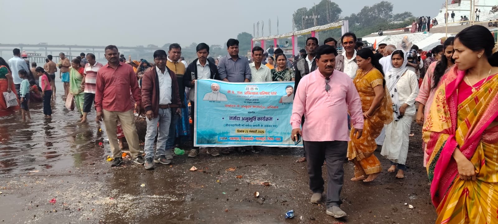 आज मा नर्मदा के तट खलघाट पर पतित पावन मा नर्मदा जयंती के पर्व पर मध्य प्रदेश जन अभियान परिषद एवं मां नर्मदा समग्र अभियान परिषद के संयुक्त तत्वाधान में ग्रामोदय से अभ्युदय अभियान के द्वारा पर्यावरण संरक्षण को ध्यान में रखते हुए स्वच्छता अभियान चलाया गया इस अवसर पर मा नर्मदा नदी में डूबने वाले लोगों की सेवा में तत्पर रहने वाले धामनोद नगर सैनिक श्री दिनेश जी वर्मा को साल एवं श्री फल से सम्मानित किया गया इस अवसर पर मध्य प्रदेश जन अभियान परिषद के विकास खण्ड समन्वयक श्री मति कविता सोलंकी नवांकुर समिति, प्रसपुठन समिति एवं मुख्य मंत्री सामुदायिक नेतृत्व क्षमता विकास पाठ्यक्रम के परामर्श दाता , बी एस डब्ल्यू एवं एम एस डब्ल्यू के छात्र , छात्राएं उपस्थित हुए