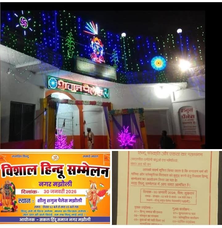 “जात-पात की करो विदाई हम सब हैं हिंदू भाई-भाई”के नारे के साथ सनातन धर्म की गरिमा, सांस्कृतिक विरासत को सुदृढ़ करने,हिंदू समाज में एकता, संस्कृति संरक्षण , युवाओं में सामाजिक जागरूकता लाकर सही दिशा में ले जाने के उद्देश्य से देश- प्रदेश व जिले भर में सकल हिंदू समाज द्वारा हिंदू सम्मेलन आयोजित किया जा रहे हैं इसी कड़ी में खंड मझौली क्षेत्र अंतर्गत उपखंड खडौरा, मंडल मड़वास, मंडल धनौली में हिंदू सम्मेलन आयोजित किया जा चुका है आज 30जनवरी 2026को नगर क्षेत्र मझौली के वार्ड क्रमांक 3 स्थित शीलू -शगुन पैलेस भैंसवाही मैं दोपहर 12 बजे से संपन्न होने जा रहा है जिसका शुभारंभ सुंदरकांड पाठ से किया जाकर समापन भारत माता की आरती पर किया जाएगा। कार्यक्रम क्रमशः सुंदरकांड पाठ, सांस्कृतिक कार्यक्रम, धार्मिक उद्बोधन, भारत माता की आरती, प्रसाद वितरण के साथ संपन्न होगा जो शाम 4 बजे तक संचालित रहेगा। आयोजक शकल हिंदू समाज नगर क्षेत्र मझौली के द्वारा क्षेत्र वासियों से अपील की गई है कि आप सभी सपरिवार कार्यक्रम में शामिल हो कार्यक्रम को सफल बनाने में भागीदारी निभाएं।