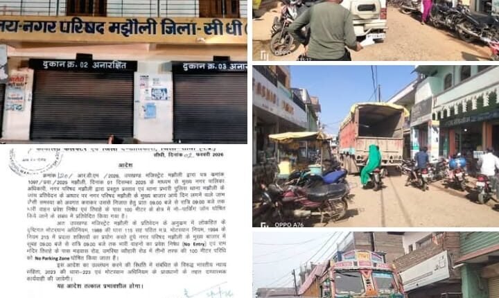 अतिक्रमण ग्रसित क्षेत्र मेन मार्केट मझौली में अब सुबह 9 से शाम 9 तक भारी वाहनों का प्रवेश नहीं होगा तथा राम मंदिर तिराहे से तीनों तरफ 100–100 मीटर की परिधि में कोई वाहन खड़े नहीं किए जाएंगे।जिसके लिए जिला कलेक्टर सीधी स्वरोचिष सोमवंशी ने प्रतिबंधात्मक आदेश जारी किया है।यह आदेश आज 2 फरवरी 2026 को उपखण्ड मजिस्ट्रेट मझौली के पत्र कमांक 1097/ प्रवा./2025 मझौली, दिनांक 01 दिसम्बर 2025 के माध्यम से मुख्य नगर पालिका अधिकारी, नगर परिषद मझौली द्वारा प्रस्तुत प्रस्ताव एवं थाना प्रभारी पुलिस थाना मझौली के जांच प्रतिवेदन के आधार पर जारी किया गया है जारी आदेश में उल्लेखित किया गया है कि नगर परिषद मझौली के मुख्य बाजार में आये दिन लगनें वाले जाम की समस्या से निजात दिलाने हेतु प्रातः 9 बजे से रात्रि 9 बजे तक भारी वाहनों के प्रवेश पर रोक लगाते हुए तिराहे के पास से तीन तरफ 100 मीटर के परिधि क्षेत्र को नो पार्किंग जोन घोषित किये जानें के संबंध में प्रतिवेदित किया गया है।