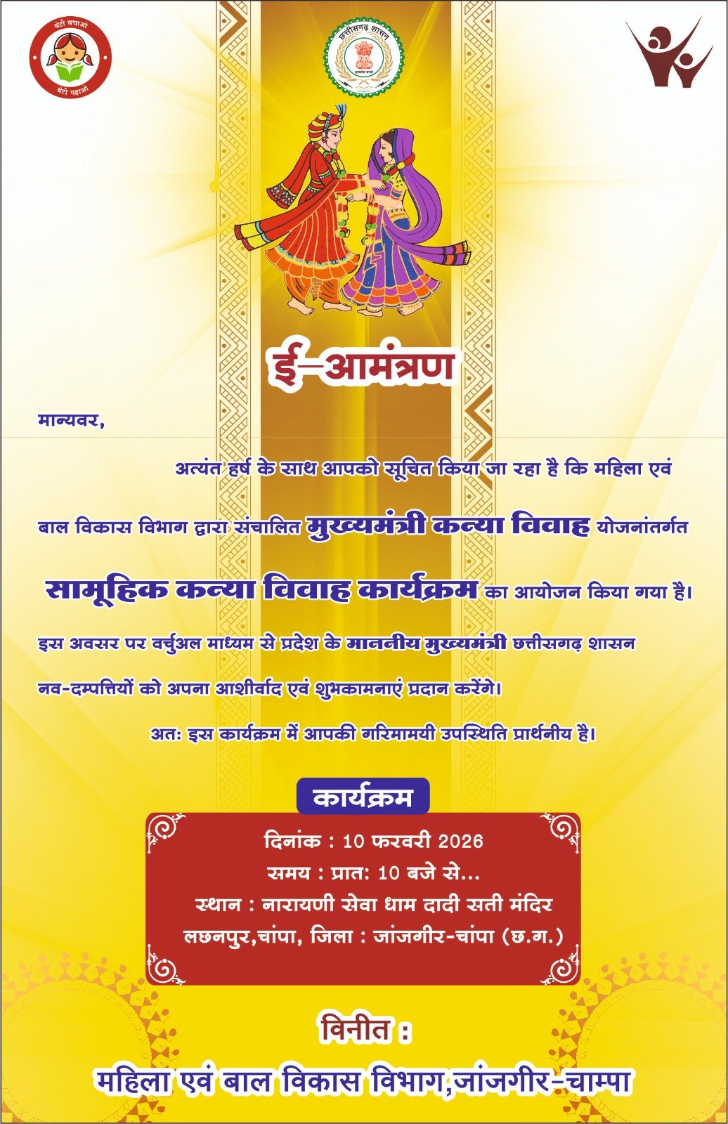 जांजगीर-चाम्पा, / मुख्यमंत्री सामूहिक कन्या विवाह योजनांतर्गत 10 फरवरी 2026 को जिले के नारायणी सेवा धाम दादी सती मंदिर, लछनपुर में सामूहिक कन्या विवाह कार्यक्रम का आयोजन किया जाएगा। जिला कार्यक्रम अधिकारी महिला एवं बाल विकास विभाग ने बताया कि इस अवसर पर जिले के कुल 141 जोड़ों का विवाह विधिवत सम्पन्न कराया जाएगा। शासन की इस महत्वाकांक्षी योजना के अंतर्गत आयोजित कार्यक्रम में वर्चुअल माध्यम से मुख्यमंत्री विष्णु देव साय द्वारा नव-दम्पत्तियों को आशीर्वाद एवं शुभकामनाएं प्रदान करेंगे। इस दौरान बेटी बचाओ, बेटी पढ़ाओ योजनांतर्गत उपस्थितों को जागरूक किया जाएगा तथा बाल विवाह मुक्त छत्तीसगढ़ बनाने शपथ दिलाया जाएगा।