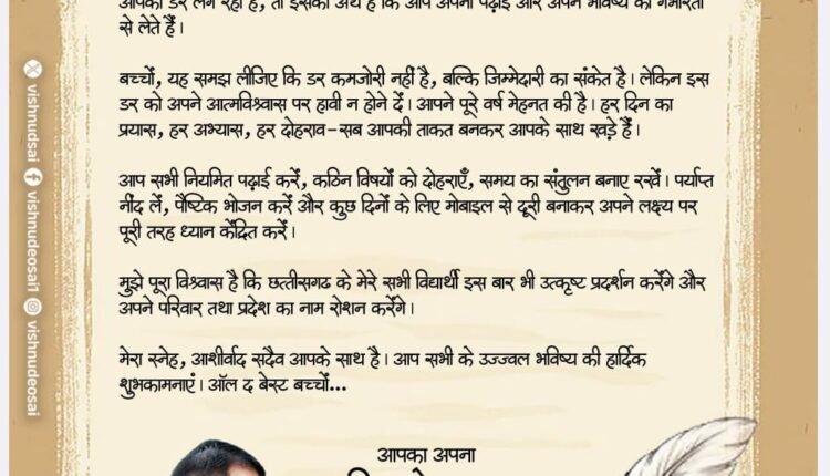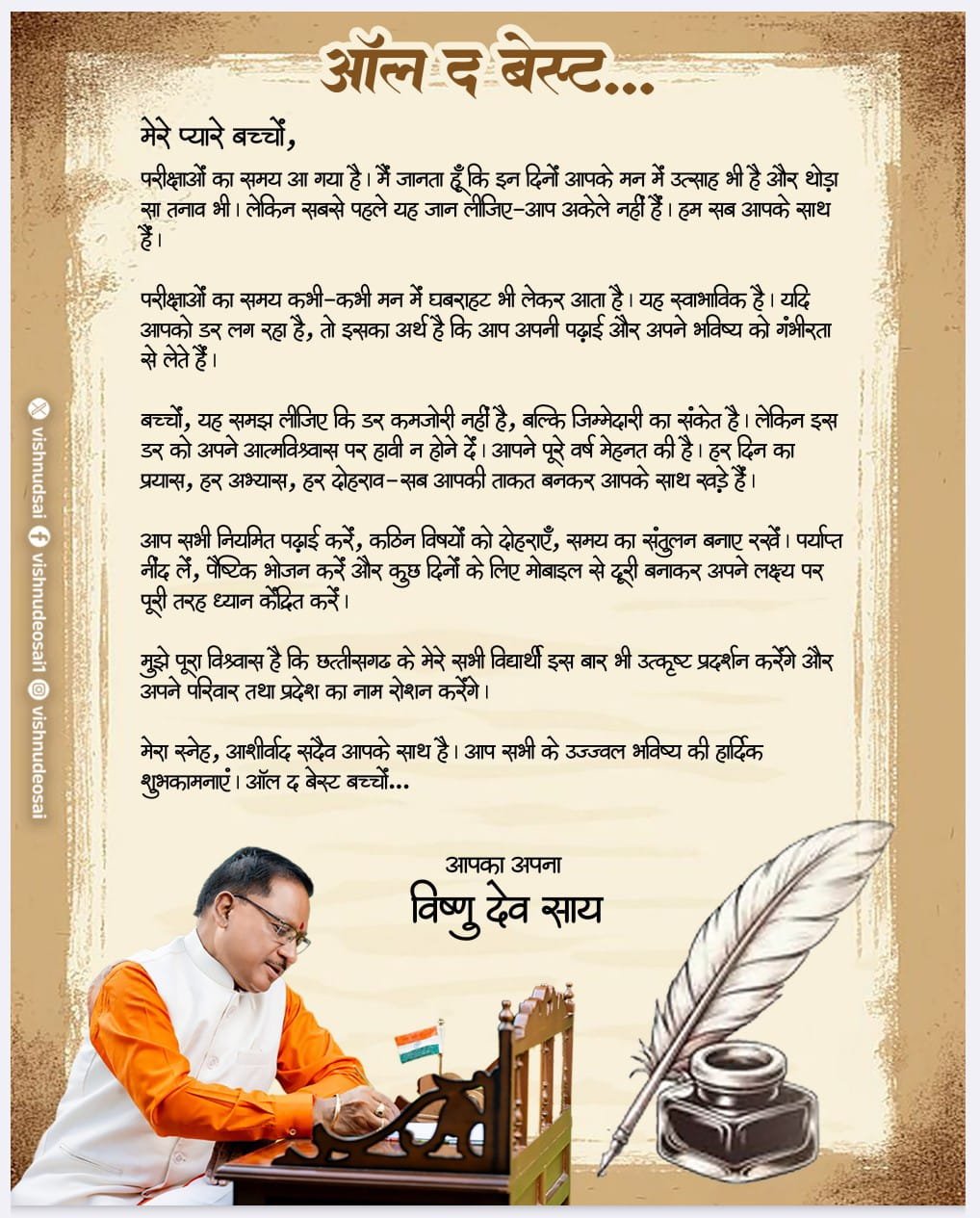 रायपुर / मुख्यमंत्री विष्णु देव साय ने विद्यार्थियों को शुभकामनाएँ देते हुए कहा — “ऑल द बेस्ट, प्यारे बच्चों।”