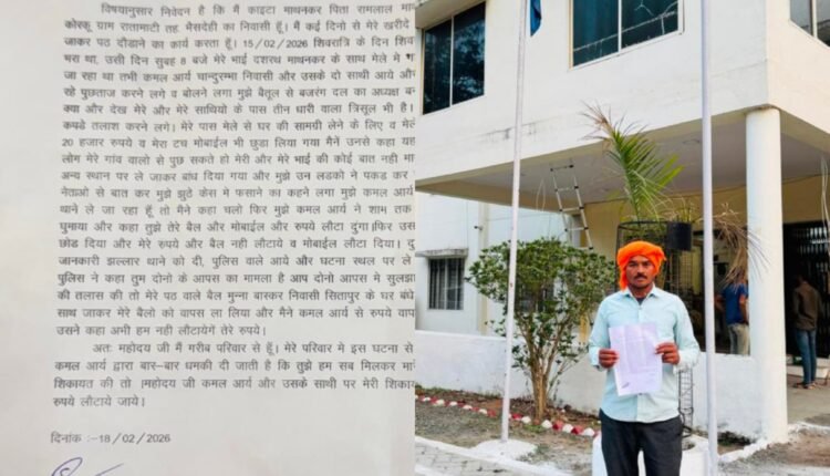 भैंसदेही / ललित छत्रपाल ;- जिला कलेक्टर एवं पुलिस अधिक्षक बैतूल को आवेदक काइटा माथनकर पिता रामलाल माथनकर जाति आदिवासी कोरकू ग्राम रातामाटी तह. भैसदेही ने लिखित शिकायत कर बजरंग दल एवं उनके अन्य दो साथियों पर गंभीर आरोप लगाते हुवे , लिखित शिकायत के माध्यम से अवगत करवाया कि मैं कई दिनों से मेरे खरीदे हुए बैलों से पठ मेलों में जाकर पठ दौडाने का कार्य करता हूँ। 15/02/2026 शिवरात्रि के दिन शिवरात्रि मेला गागडखेडा मे भरा था, उसी दिन सुबह 8 बजे मेरे भाई दशरथ माथनकर के साथ मेले में भाग लेने गंगाडखेडा बैल दौडाने ले जा रहा था तभी बजरंग दल नेता चान्दुरम्भा निवासी और उसके दो साथी आये और हमसे बैल कहा ले जा रहे पुछताज करने लगे व बोलने लगा मुझे बैतूल से बजरंग दल का अध्यक्ष बनाया है तुझे पता नहीं है क्या और देख मेरे और मेरे साथियो के पास तीन धारी वाला त्रिसूल भी है। मुझे और मेरे भाई के कपडे तलाश करने लगे। मेरे पास मेले से घर की सामग्री लेने के लिए व मेले मे पठ दौडाने के लिए 20 हजार रुपये व मेरा टच मोबाईल भी छुडा लिया गया मैनें उनसे कहा यह बैल मेरे घर के है तुम लोग मेरे गांव वालो से पुछ सकते हो मेरी और मेरे भाई की कोई बात नहीं मानी। फिर मेरे बैलो को किसी अन्य स्थान पर ले जाकर बांध दिया गया और मुझे उन लडको ने पकड़ कर रखा, और किसी बैतूल के नेताओ से बात कर मुझे झुठे केस में फसाने का कहने लगा , मुझे बजरंग दल के नेता ने कहा तुझे मैं झल्लार थाने ले जा रहा हूँ तो मैने कहा चलो फिर मुझे उस नेता ने शाम तक अपनी मोटरसाइकल से घुमाया और कहा तुझे तेरे बैल और मोबाईल और रुपये लौटा दूंगा। फिर उसने मुझे चान्दुरम्भा लाकर छोड दिया और मेरे रुपये और बैल नहीं लौटाये व मोबाईल लौटा दिया। दुसरे दिन इस घटना की जानकारी झल्लार थाने को दी, पुलिस वाले आये और घटना स्थल पर ले गये और कहा कि मुझे पुलिस ने कहा तुम दोनो के आपस का मामला है आप दोनो आपस में सुलझा लो। फिर मैनें मेरे बैलो की तलास की तो मेरे पठ वाले बैल मुन्ना बारस्कर निवासी सितापुर के घर बंधे मिले मैने मेरे परिवार के साथ जाकर मेरे बैलो को वापस ला लिया और मैने रुपये वापस करने की बात की तो उसने कहा अभी हम नहीं लौटायेगें तेरे रुपये उक्त आरोप बजरंग दल नेता कमल आर्य एवं उनके दो अन्य साथियों पर लगाए गए है , आवेदक ने आगे बताया कि वह गरीब परिवार से है। मेरे परिवार मे इस घटना से सब डरे हुए है और मुझे कमल आर्य द्वारा बार-बार धमकी दी जाती है कि तुझे हम सब मिलकर मारेगें अगर तुमने पुलिस मे शिकायत की तो। महोदय जी कमल आर्य और उसके साथी पर मेरी शिकायत पर कार्यवाही कर मेरे रुपये लौटाये जाने का निवेदन किया है , अब देखना यह होगा कि आवेदक को कब तक न्याय मिल पाता है,