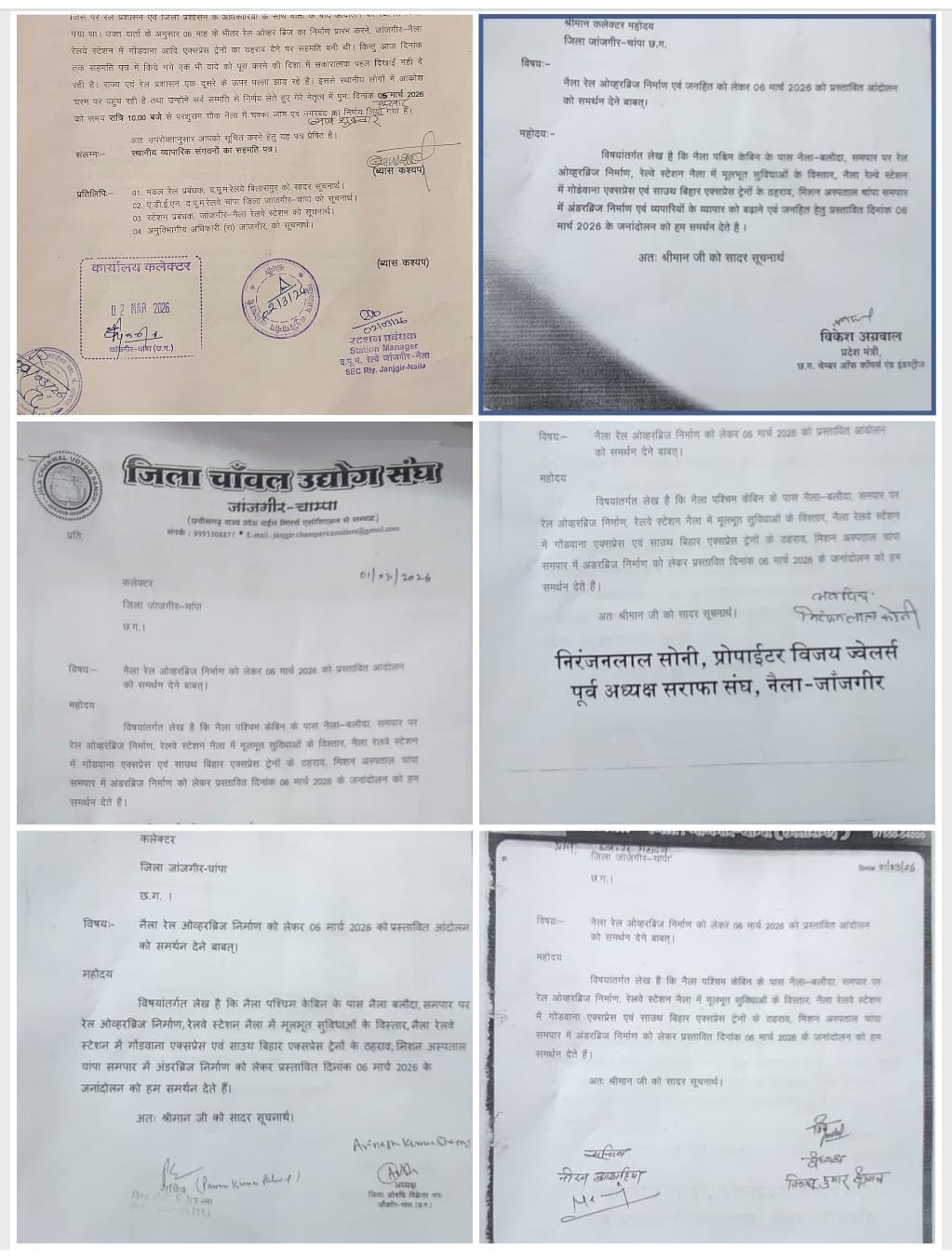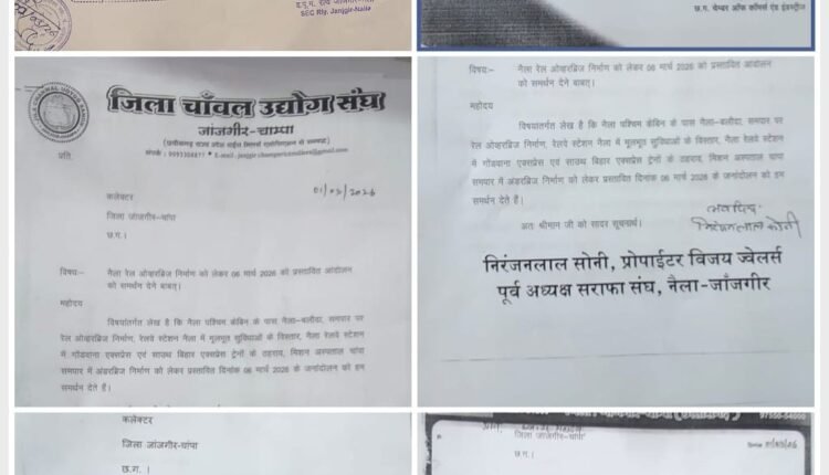 जांजगीर-चांपा – जांजगीर-नैला रेलवे स्टेशन के पश्चिम केबिन पर प्रस्तावित रेल ओव्हरब्रिज निर्माण, स्टेशन में मूलभूत सुविधाओं के विस्तार तथा प्रमुख एक्सप्रेस ट्रेनों के ठहराव की मांगों को लेकर स्थानीय नागरिकों ने 05 मार्च 2026 को रात 10 बजे से परशुराम चैक, नैला में चक्का जाम एवं 06 मार्च को नगर बंद की घोषण की है। इस संबंध में कलेक्टर जिला जांजगीर-चांपा को पत्र सौंपकर प्रशासन को औपचारिक सूचना दी गई है। इस आंदोलन को स्थानीय व्यापारिक संगठनों जैसे छ.ग. चेम्बर आॉफ काॅमर्स एंड इंडस्ट्रीज, जिला केमिस्ट एंड ड्रगिस्ट एसोसिएशन, गल्ला किराना व्यापारी संघ, जिला चावल उद्योग संघ, कपड़ा व्यापारी संघ ने भी अपना समर्थन दिया है। पत्र में उल्लेख है कि पूर्व में इन मांगों को लेकर जन आंदोलन किया गया था। तब रेल प्रशासन और जिला प्रशासन के साथ हुई वार्ता में सहमती बनी थी कि छः माह के भीतर रेल ओव्हरब्रिज निर्माण प्रारंभ किया जाएगा तथा जांजगीर-नैला स्टेशन पर गोड़वाना एक्सप्रेस, साउथ बिहार एक्सप्रेस ट्रेनों के ठहराव पर सकारात्मक निर्णय लिया जाएगा। इसके अलावा मिशन अस्पताल समपार के पास अंडरब्रिज निर्माण और जांजगीर-नैला रेलवे स्टेशन पर मूलभूत सुविधाओं के विस्तार का भी आश्वासन दिया गया था। आरोप है कि सहमति के बावजूद अब तक किसी भी वादे पर ठोस प्रगति नही हुई है। राज्य और रेल प्रशासन के बीच समन्वय के अभाव से कार्य अटका हुआ है, जिससे स्थानीय नागरिकों में आक्रोश व्याप्त है। पत्र में कहा गया है कि सर्वसम्मति से आंदोलन का निर्णय लिया गया है और इसकी जिम्मेदारी प्रशासन की होगी। आंदोलन की सूचना की प्रतिलिपि मंडल रेल प्रबंधक बिलासपुर, ए.डी.ई.एन. द.पू.म.रेलवे चांपा, स्टेशन प्रबंधक जांजगीर-नैला, तथा अनुविभागीय अधिकारी (राजस्व) जांजगीर को भी प्रेषित की गई है।