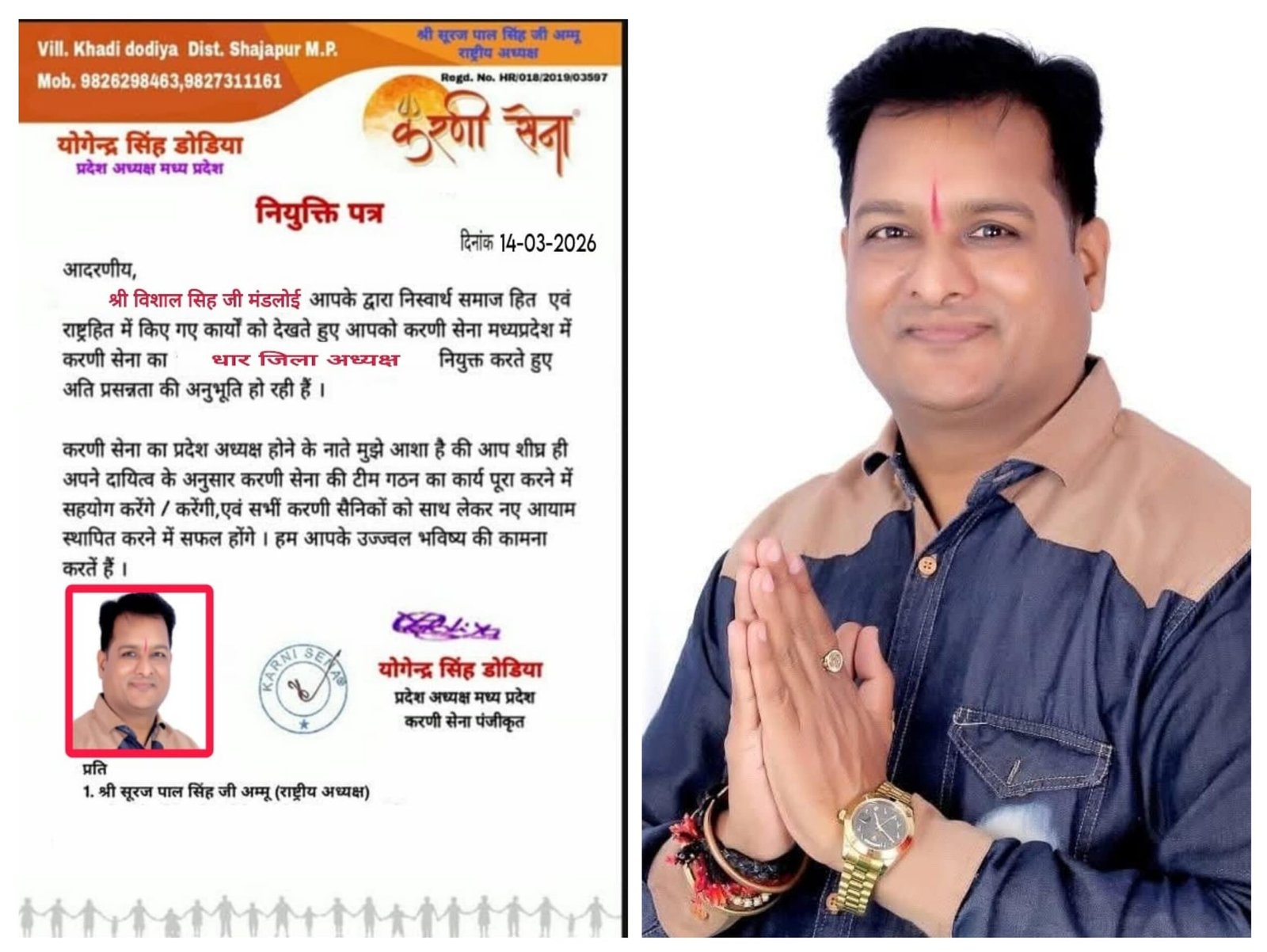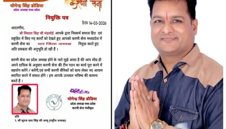 धामनोद। सामाजिक और संगठनात्मक गतिविधियों में लगातार सक्रिय रहने वाले समाजसेवी विशाल सिंह मंडलोई को करणी सेना मध्यप्रदेश का धार जिला अध्यक्ष नियुक्त किया गया है। उनकी नियुक्ति संगठन के राष्ट्रीय अध्यक्ष सूरजपाल अम्मू तथा मध्यप्रदेश प्रदेश अध्यक्ष योगेंद्र सिंह डोडिया के नेतृत्व में की गई।