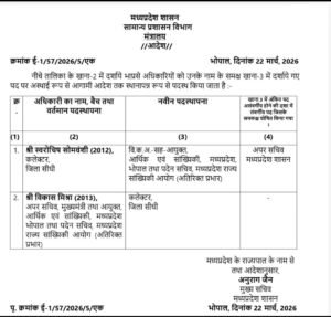 भोपाल, 22 मार्च 2026।मध्यप्रदेश शासन के सामान्य प्रशासन विभाग ने भारतीय प्रशासनिक सेवा (IAS) अधिकारियों के तबादले के आदेश जारी किए हैं। जारी आदेश के अनुसार मुख्यमंत्री सचिवालय में पदस्थ अपर सचिव विकास मिश्रा (2013 बैच) को जिला सीधी का नया कलेक्टर नियुक्त किया गया है। वे पूर्व में डिंडोरी जिले के कलेक्टर रह चुके हैं और प्रशासनिक अनुभव के आधार पर उन्हें यह नई जिम्मेदारी सौंपी गई है।