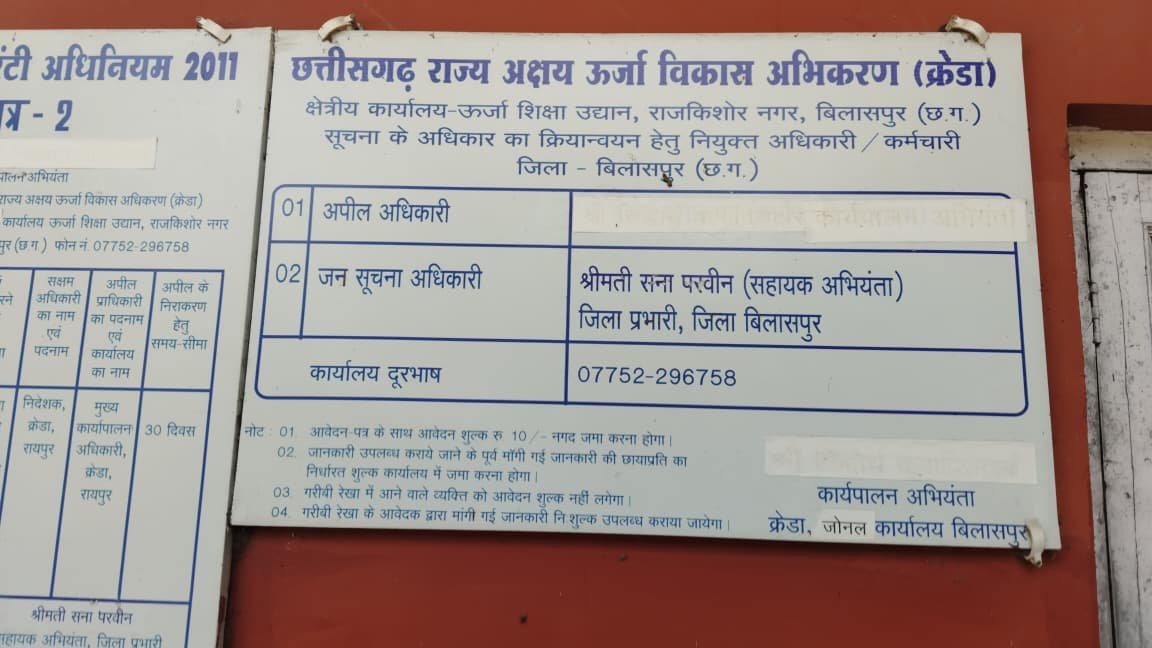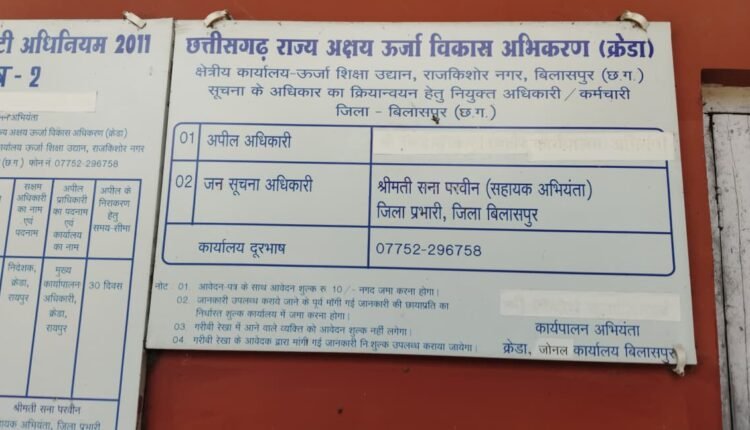 बिलासपुर | शासन-प्रशासन भले ही सरकारी कामकाज में पारदर्शिता और सुशासन के दावे करता हो, लेकिन छत्तीसगढ़ राज्य अक्षय ऊर्जा विकास अभिकरण (CREDA) के राजकिशोर नगर स्थित जोनल कार्यालय में स्थिति इसके बिल्कुल उलट है। यहाँ सूचना के अधिकार (RTI) के तहत जानकारी उपलब्ध कराना तो दूर, जन सूचना अधिकारी (PIO) का संपर्क नंबर मिलना भी आम आदमी के लिए ‘नाममुकिन’ लक्ष्य बन गया है।