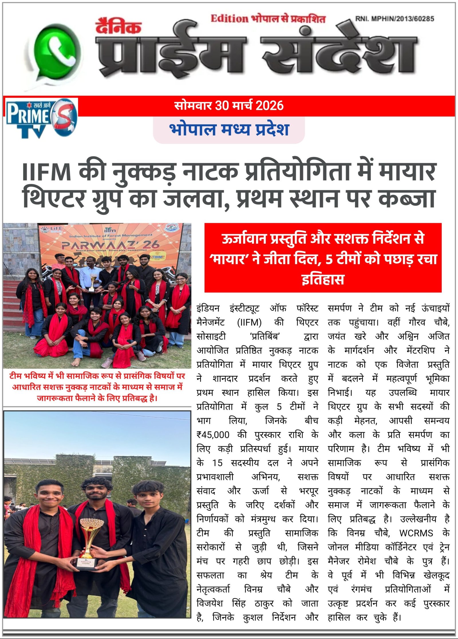 इंडियन इंस्टीट्यूट ऑफ फॉरेस्ट मैनेजमेंट (IIFM) की थिएटर सोसाइटी ‘प्रतिबिंब’ द्वारा आयोजित प्रतिष्ठित नुक्कड़ नाटक प्रतियोगिता में मायार थिएटर ग्रुप ने शानदार प्रदर्शन करते हुए प्रथम स्थान हासिल किया। इस प्रतियोगिता में कुल 5 टीमों ने भाग लिया, जिनके बीच ₹45,000 की पुरस्कार राशि के लिए कड़ी प्रतिस्पर्धा हुई।