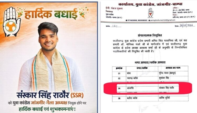 युवा कांग्रेस में नई नियुक्ति, संस्कार सिंह राठौर को सौंपी गई जांजगीर नगर अध्यक्ष की कमान प्रदेश नेतृत्व के निर्देश पर हुई नियुक्ति, कार्यकर्ताओं में उत्साह