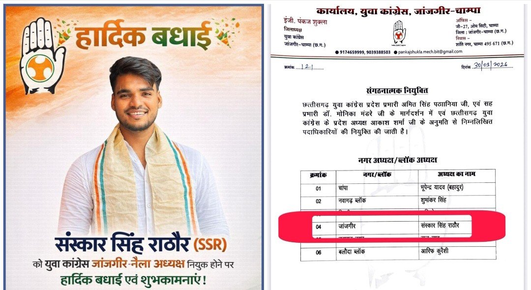 जांजगीर-चांपा – जिले में युवा कांग्रेस संगठन को और अधिक सक्रिय एवं सशक्त बनाने के उद्देश्य से महत्वपूर्ण संगठनात्मक बदलाव किया गया है। इसी क्रम में संस्कार सिंह राठौर को जांजगीर नगर अध्यक्ष पद की जिम्मेदारी सौंपी गई है।