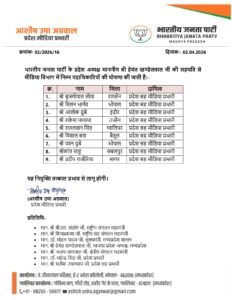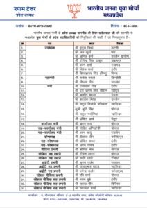 वहीं मीडिया विभाग में 8 प्रदेश सह मीडिया प्रभारी नियुक्त किए गए हैं, जिनमें बृजगोपाल लोया, मिलन भार्गव, आलोक दुबे, राकेश पंड्या और अन्य शामिल हैं। इसके अलावा पार्टी ने 33 प्रदेश प्रवक्ताओं की सूची भी जारी की है, जिसमें विधायकों और वरिष्ठ नेताओं को प्रमुख जिम्मेदारी दी गई है। उल्लेखनीय नामों में अर्चना चिटनिस, उषा ठाकुर, गौरव पारधी, संदीप जायसवाल और डॉ. योगेश पंडाग्रे शामिल हैं।