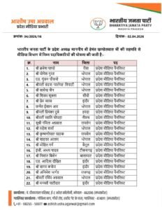 भोपाल, 2 अप्रैल 2026।मध्यप्रदेश में संगठन को और मजबूत करने के उद्देश्य से व्यापक स्तर पर नियुक्तियां की गई हैं। प्रदेश अध्यक्ष की सहमति से और पार्टी के मीडिया विभाग में कई महत्वपूर्ण पदों पर नई जिम्मेदारियां सौंपी गई हैं।